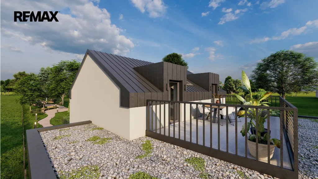 Rozlehlý zahradní prostor s lavičkami a odpočinkovou zónou je ideálním místem pro trávení volného času s rodinou.