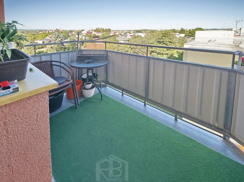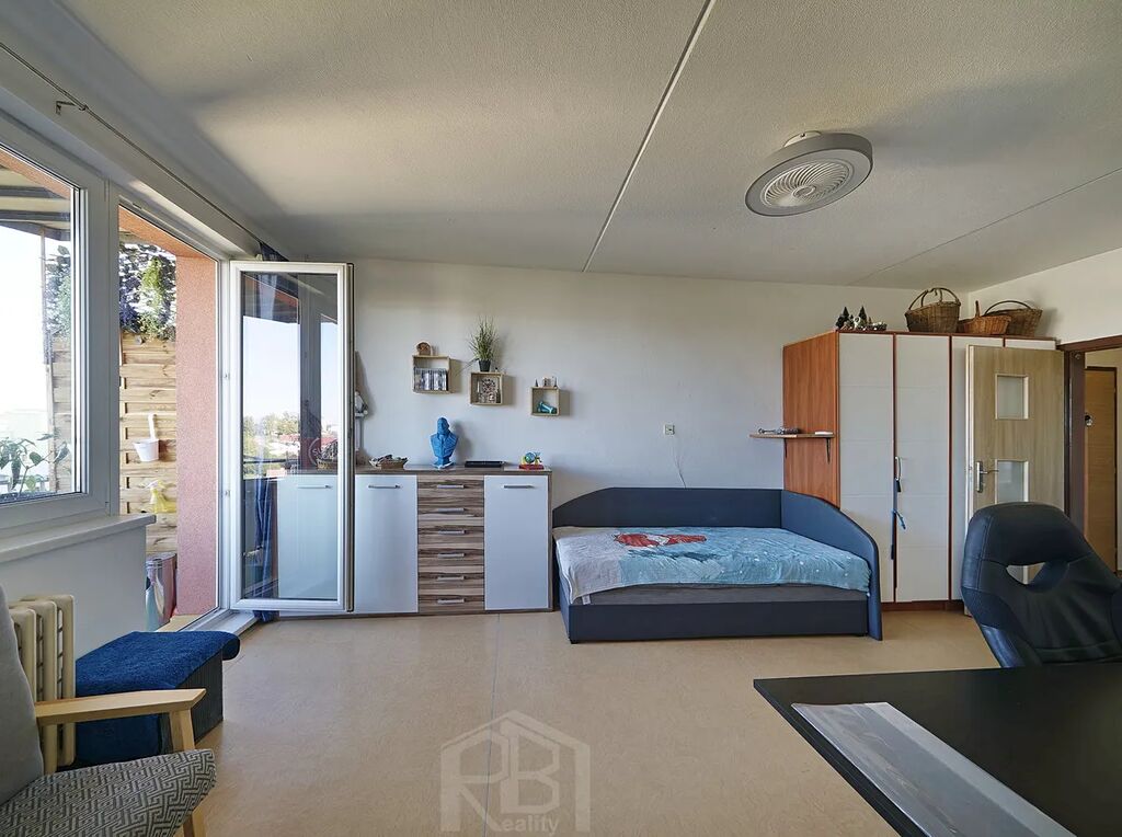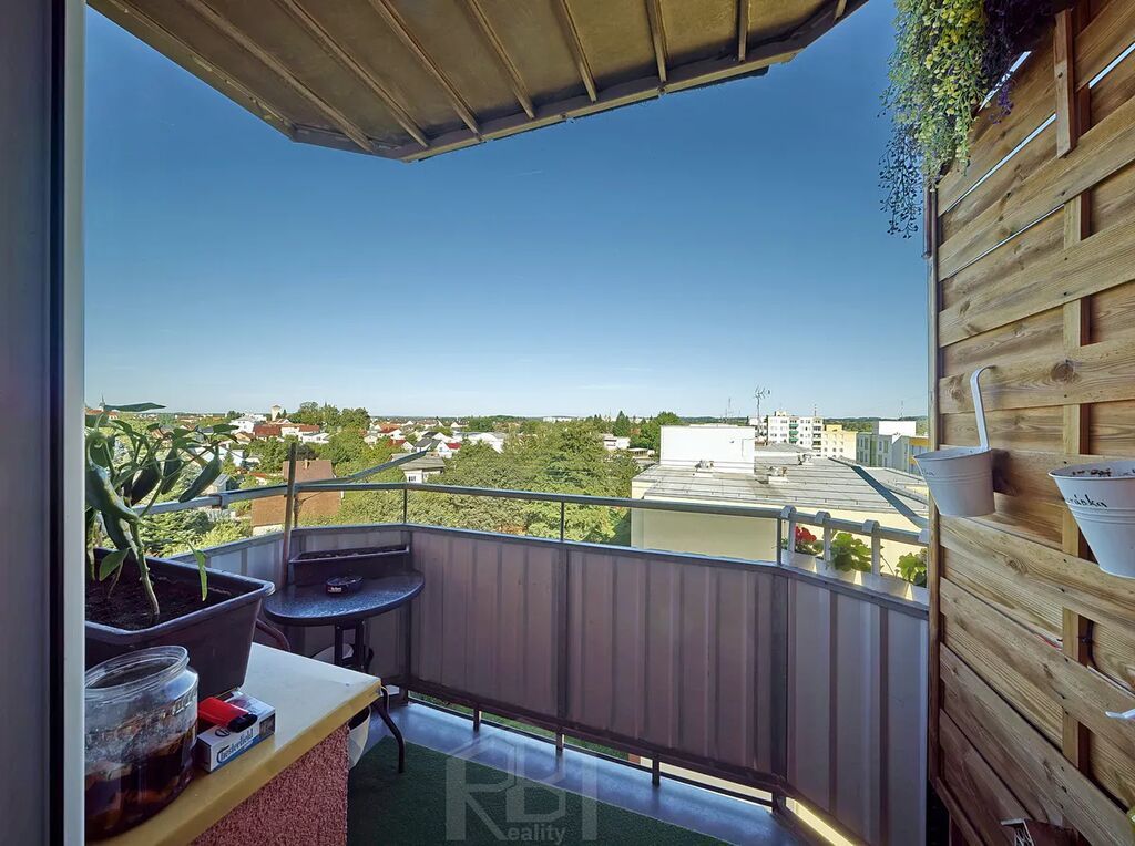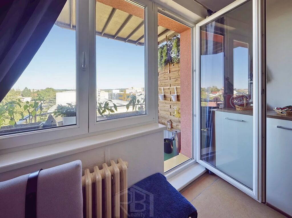 Z oken a balkonu je pěkný výhled na město, nezastíněný dalšími paneláky. Okna jsou orientována východním a severním směrem, v létě tak byt není vystaven nadměrnému slunečnímu záření.