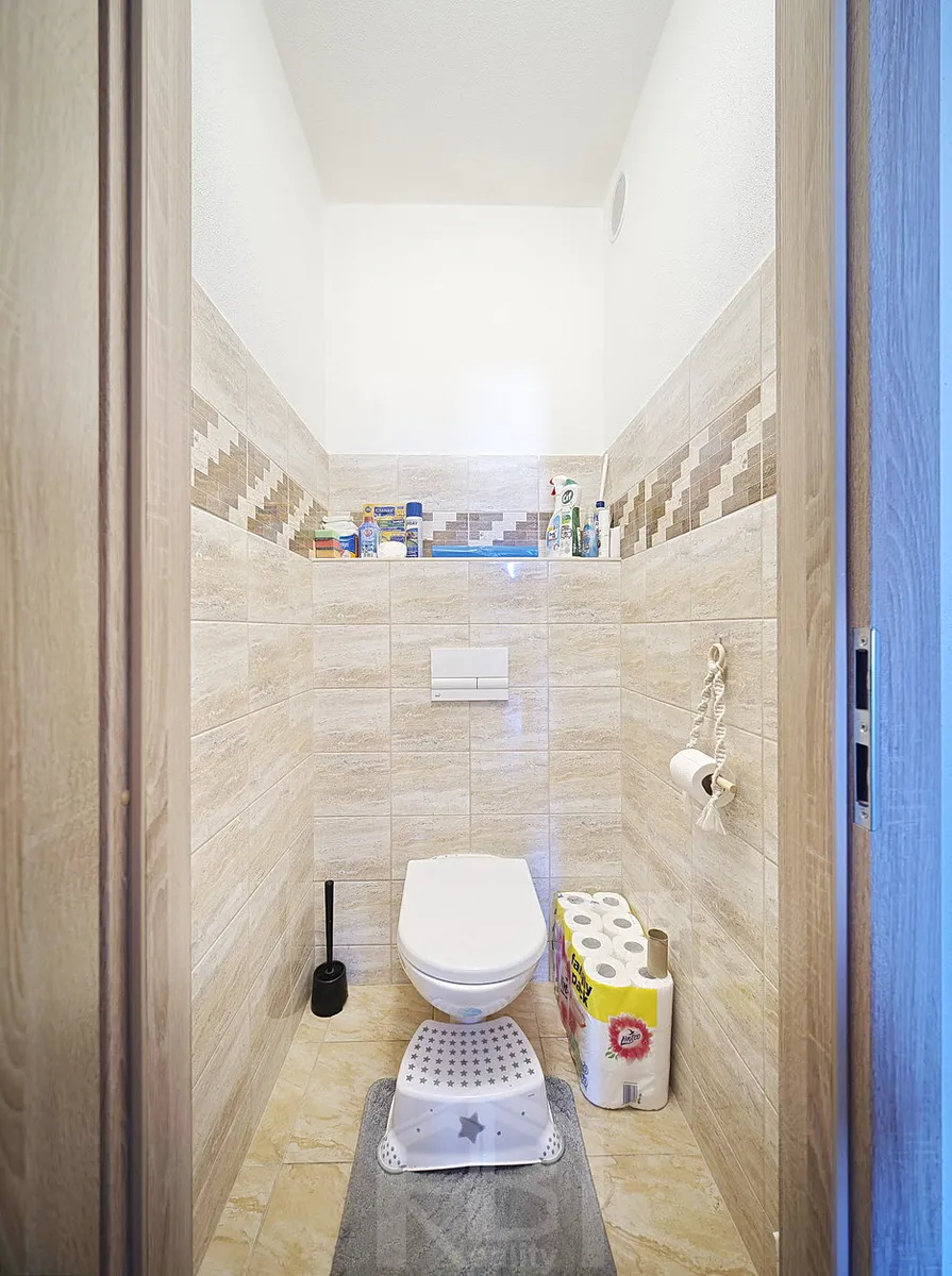 Plocha místností: předsíň 7,58 m2, koupelna 2,8m2, WC 0,98 m2, kuchyň 12,08 m2, pokoj 12,16 m2, pokoj 20,29 m2, pokoj 8,02 m2, balkon 3,6 m2, sklep 2,06 m2.