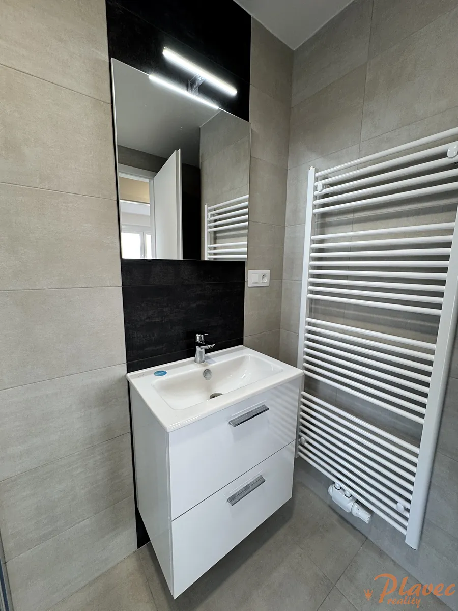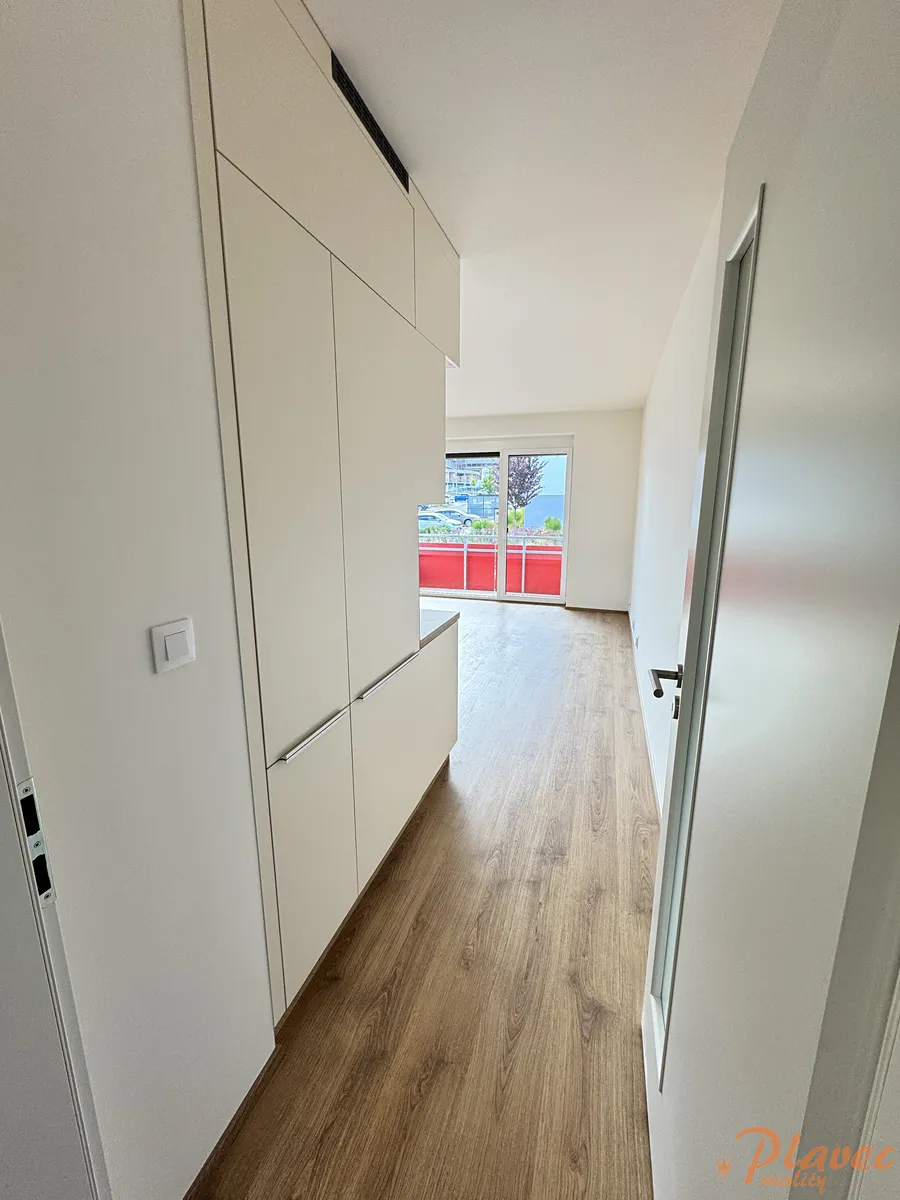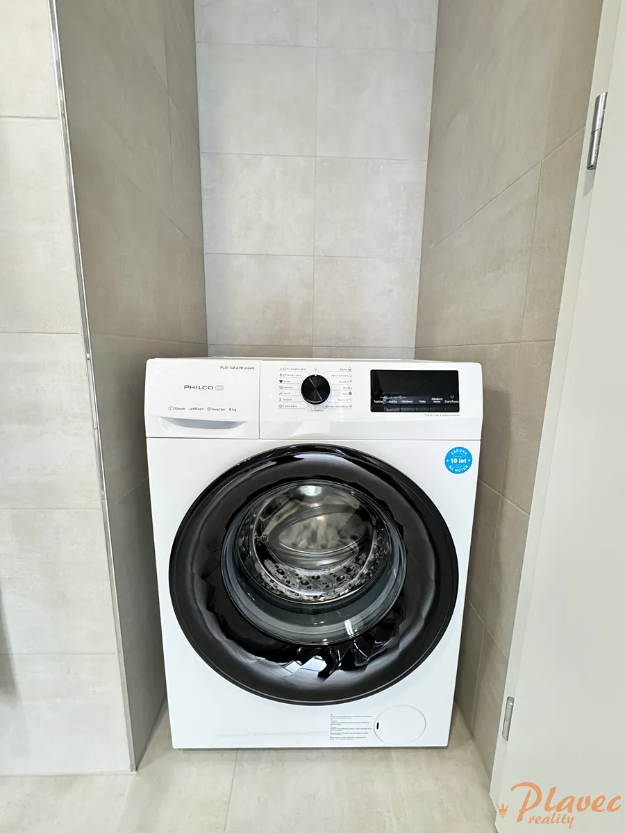 Byt se nachází v 1. patře/ 3 s výtahem. Byt je úplně nový, zatím v něm nikdo nebydlel. Má bezpečnostní dveře, venkovní rolety na dálkové ovládání. Dále je zde kuchyňská linka vybavená elektrickou troubou, indukční deskou, myčkou, lednicí, mrazákem, mikrovlnkou (vše zn. MORA) a v koupelně je také pračka (zn. PHILCO). Orientace obývacího pokoje je na Jiho - Západ.