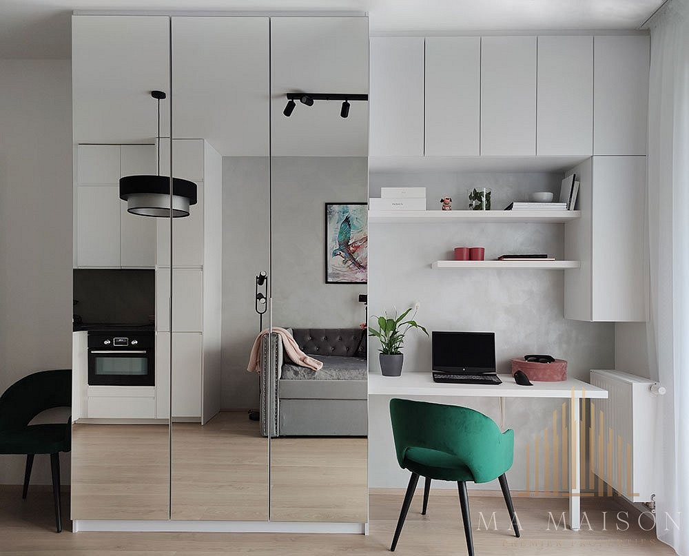 Byt se pronajímá plně vybavený. Kuchyň je moderně zařízená spotřebiči, včetně myčky, varné desky, kombinované a horkovzdušné trouby, digestoře a lednice. K dispozici je i základní nádobí. Ve spací části najdete výsuvnou postel, velkou zrcadlovou skříň a pracovní stůl. Další šatní skříň na míru je umístěna v předsíni. Koupelna je vybavena sprchovým koutem, WC, umyvadlem, skříňkami a pračkou se sušičkou (2v1).