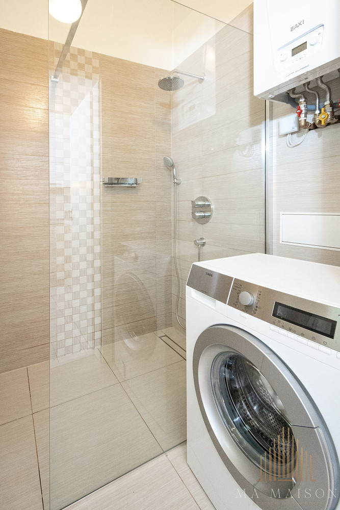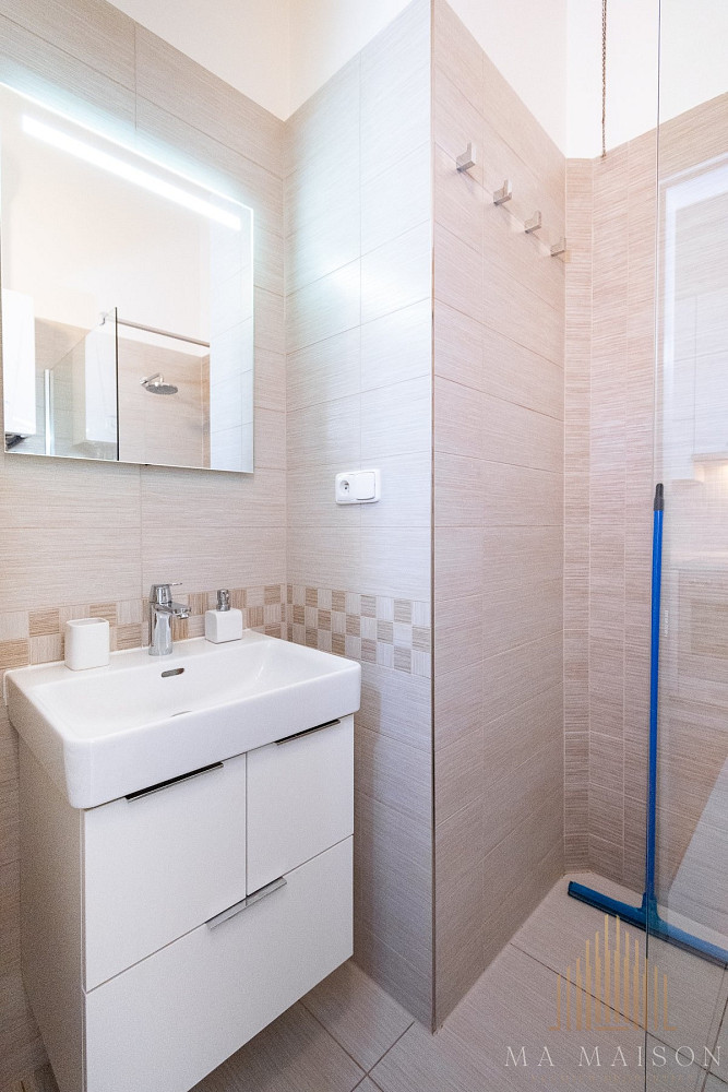 Byt se stává z předsíně, která je vybavená šatní skříní a botníkem. Toaletou, která je oddělena od koupelny. Obývací pokoj je vybaven jídelním stolem s židlemi, konferenčním stolkem. Součástí obývacího pokoje je kuchyňská linka, která je vybavena vestavnou lednicí s mrazákem, digestoří, varnou deskou, troubou a mikrovlnnou troubou. Z kuchyně je vstup do koupelny, která je vybavena prostornou walk-in sprchou, pračkou, zrcadlem, umyvadlem a umyvadlovou skříňkou. Poslední místností je ložnice, která je vybavena manželskou postelí vč. roštů bez matrací, šatními skříněmi a policemi.