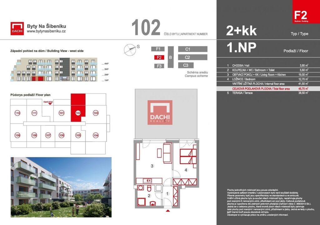Navazujeme na úspěch první etapy a přinášíme vám jedinečnou příležitost pořídit si nový domov v atraktivním projektu Byty Na Šibeníku. DACHI, prodejce a partner developera, vám v rámci druhé etapy nabízí ke koupi byt 2+kk (č. 102) o ploše 43,6 m s terasou o velikosti 40 m. Byt se nachází v 1. nadzemním podlaží bytového domu F2, který je součástí šestipodlažního objektu se čtyřmi nadzemními a dvěma podzemními podlažími.