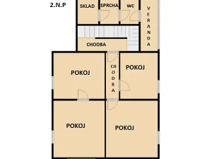 V druhém nadzemním podlaží jsou k dispozici čtyři pokoje, koupelna se sprchovým koutem, samostatné WC a technická místnost.