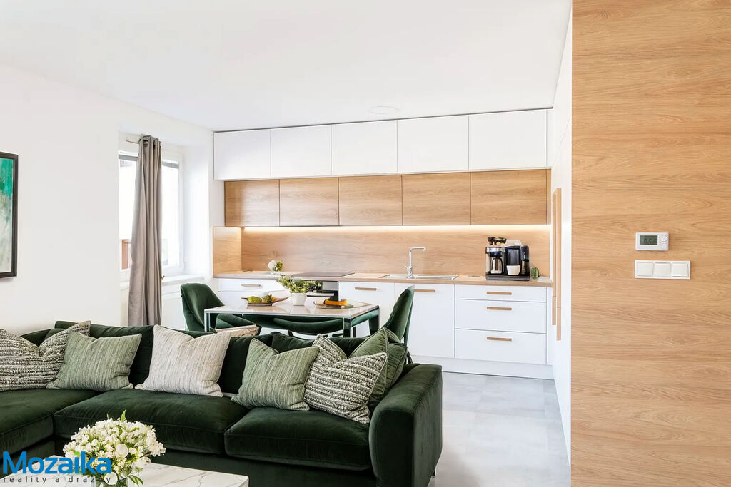 - Vybavení: moderní kuchyňská linka s vestavnými spotřebiči, vestavné skříně, sprchový kout, pračka