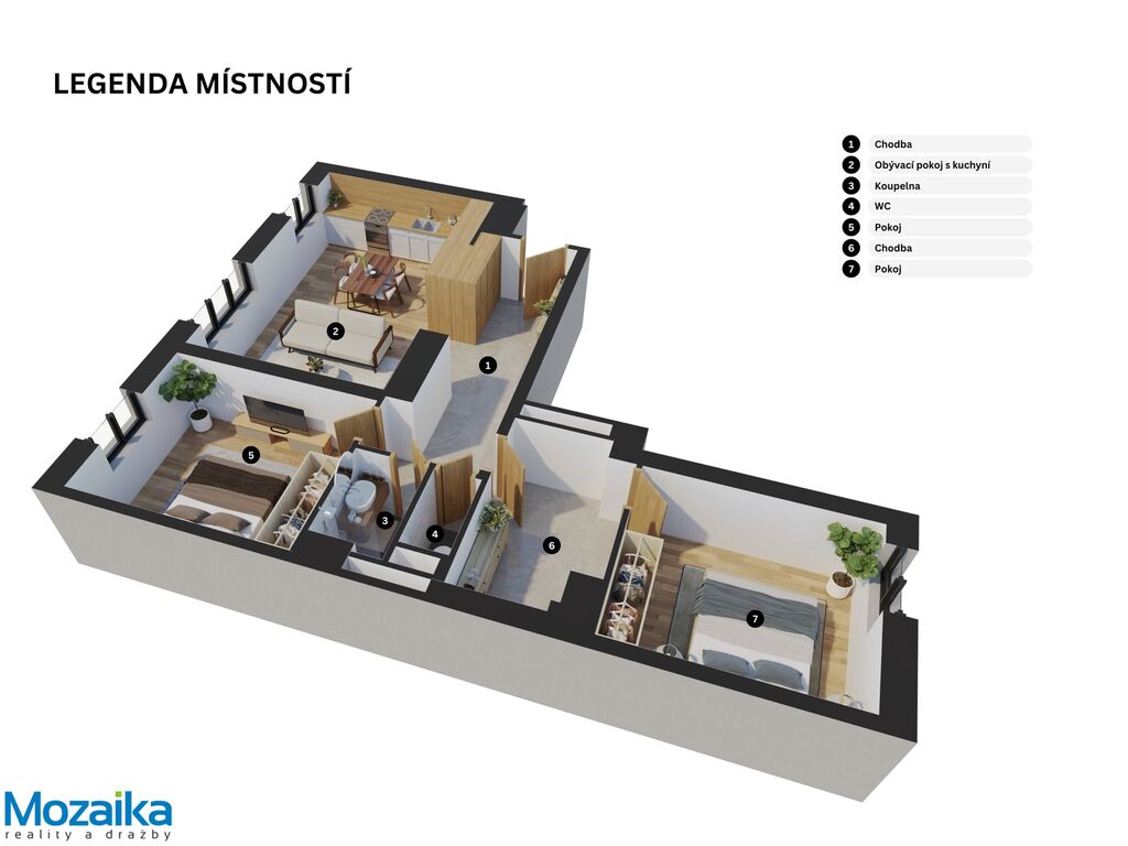 - Dispozice: 3+kk + průchozí pokoj bez okna
