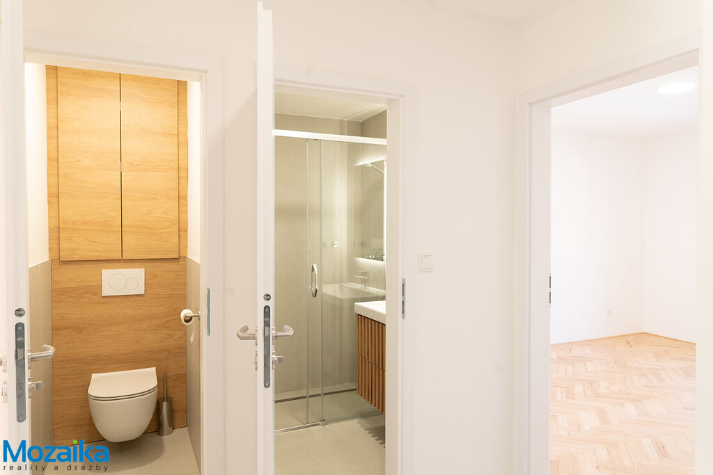Koupelna je vybavena praktickým sprchovým koutem a je řešena v moderním designu. Celý byt působí harmonicky a nabízí skutečně příjemné bydlení pro náročné nájemníky, páry nebo menší rodiny.
