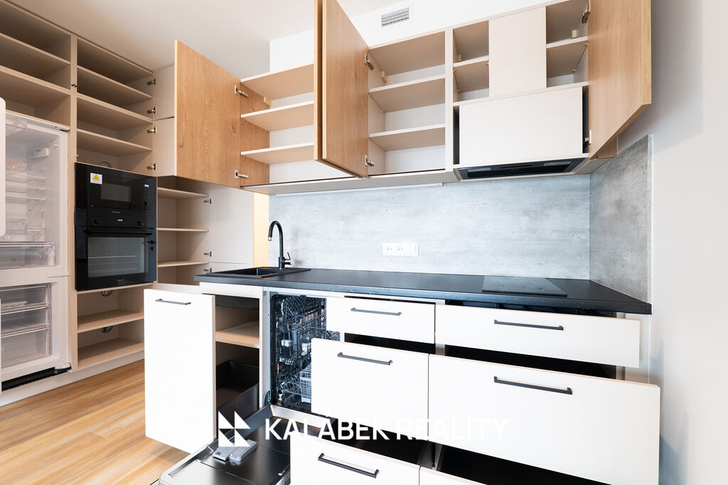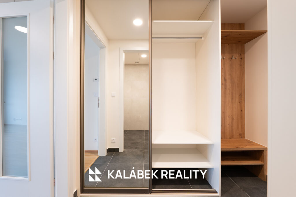 Dispozice bytu tvoří obývací prostor s plně vybavenou kuchyňskou linkou HANÁK (indukční deska, trouba, mikrovlnná trouba, lednice s mrazákem, myčka), koupelna se sprchovým koutem a WC, a vstupní chodba s vestavěnou skříní na míru. Z obytné části je vstup na lodžii orientovanou na východ. Byt je vybaven systémem řízeného větrání s rekuperací tepla. Dále je součástí standardu zabezpečovací systém Jablotron. Energetická třída B.
