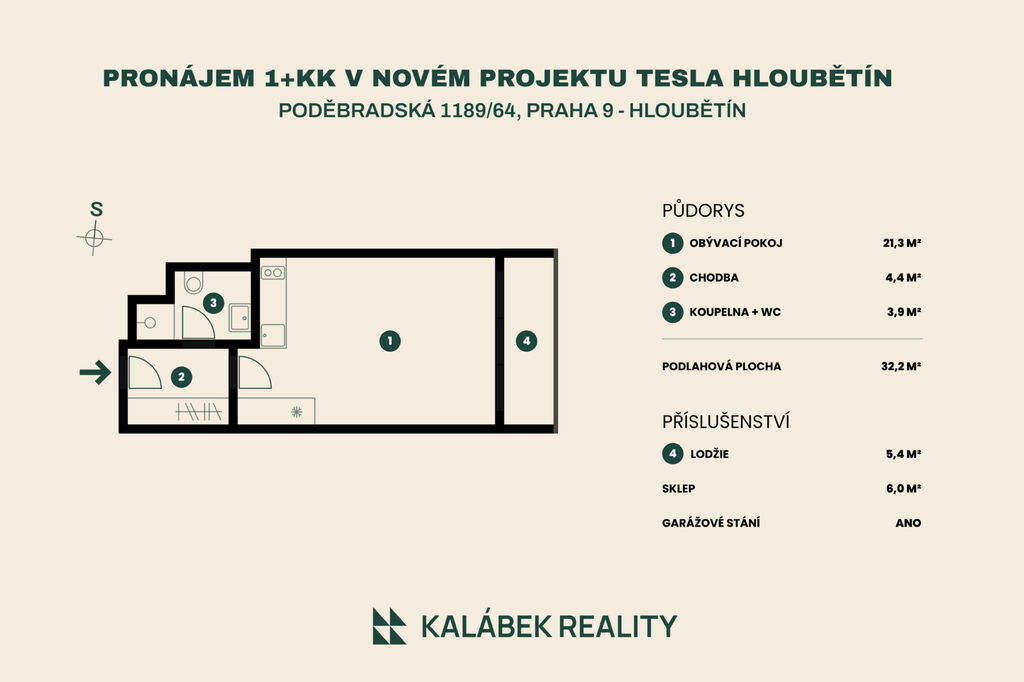 Byt 1+kk k dlouhodobému pronájmu o podlahové ploše 32,2 m², který se nachází v 5. nadzemním podlaží novostavby rezidence Tesla Hloubětín s výtahem. K bytu náleží prostorná lodžie (5,4 m²), sklepní kóje (5,3 m²) a garážové stání v -1. podzemním podlaží.