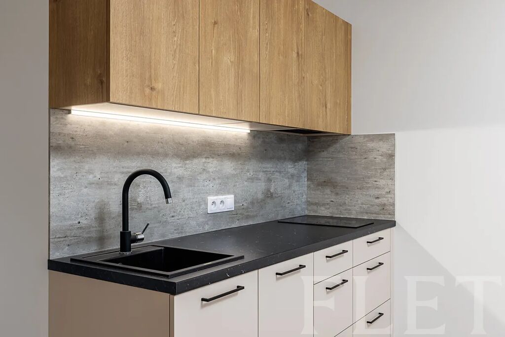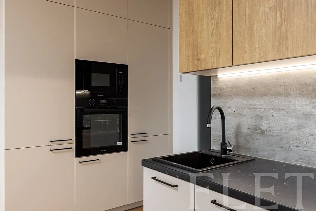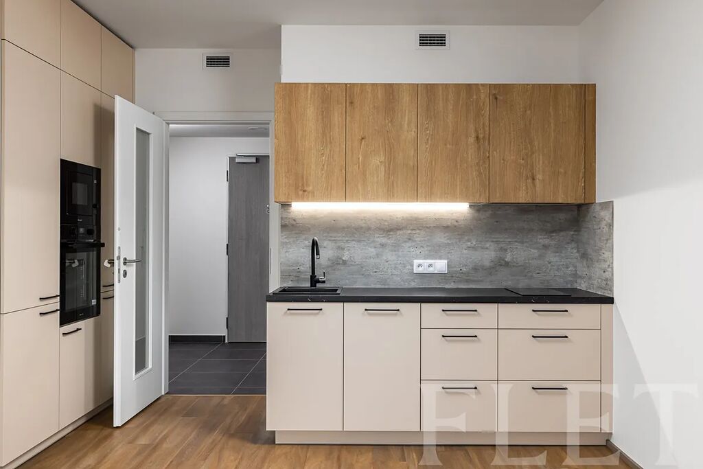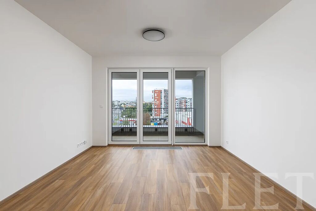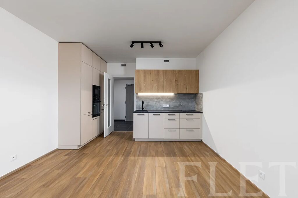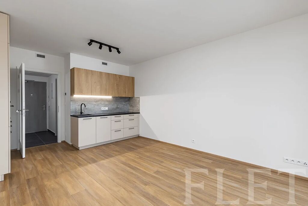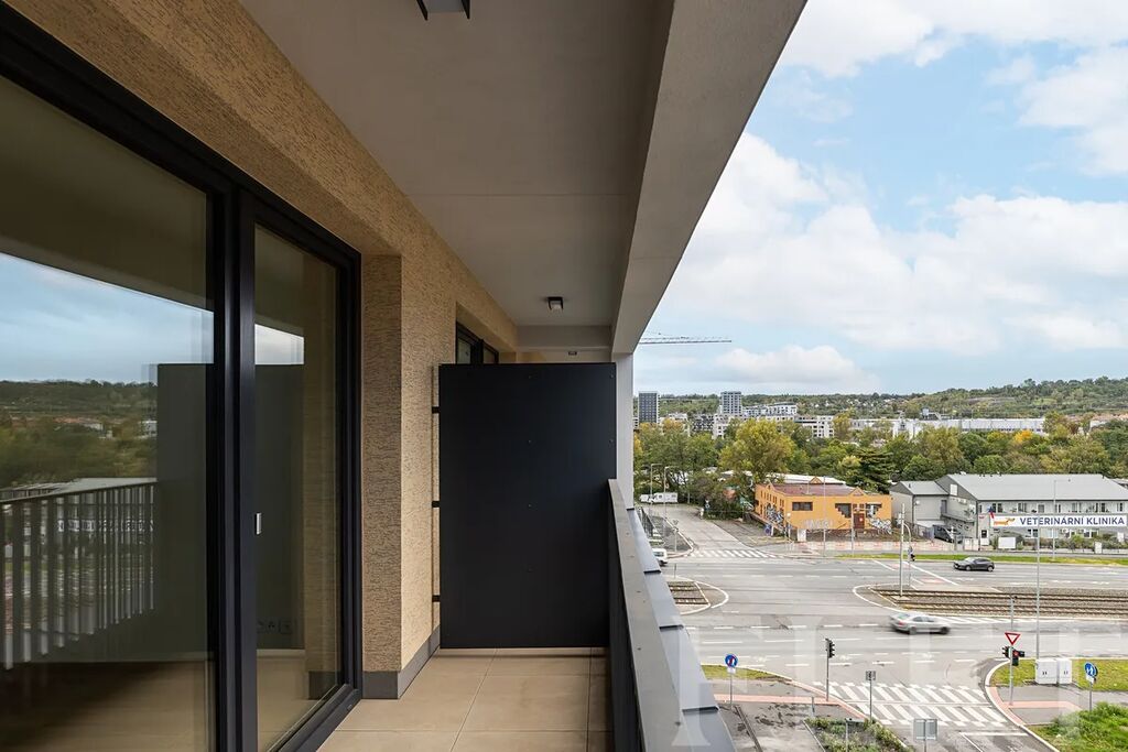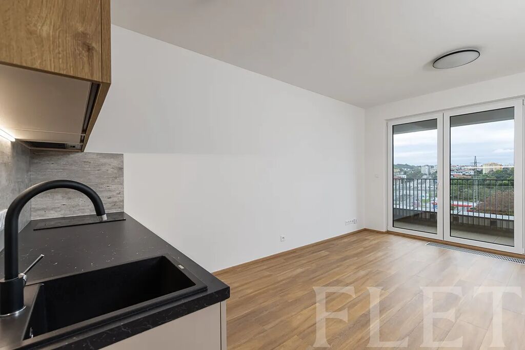 Při dispozici 1+kk nabízí prostornou hlavní místnost s moderním kuchyňským koutem, který je vybaven elektrickou i mikrovlnou troubou, myčkou nádobí a vestavěnou lednicí s mrazákem. Odsud vejdete na prostornou lodžii, kde můžete relaxovat při výhledu do dalekého okolí. Z předsíně je vstup do koupelny se sprchovým koutem, toaletou a pračkou.