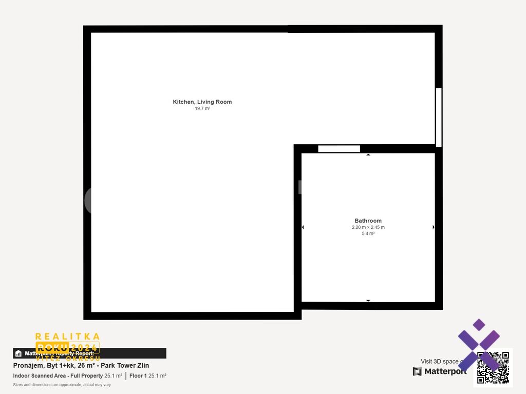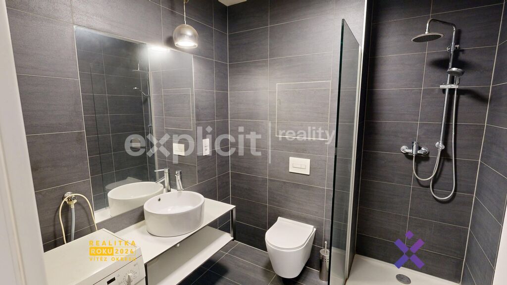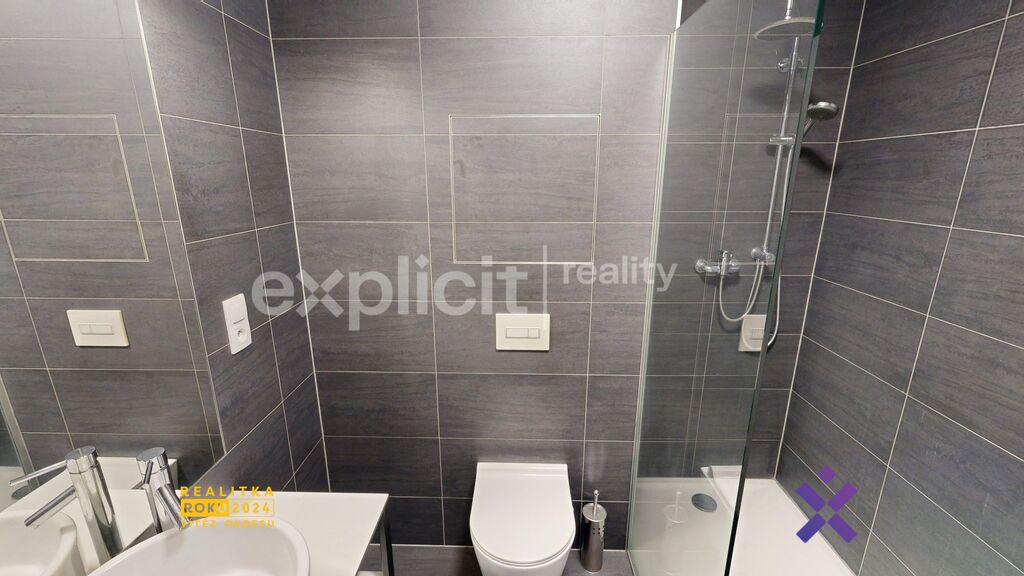 Po vstupu do bytu se ocitnete v předsíni, odkud se dostanete do hlavní obytné místnosti propojené s moderní kuchyní. Ta je plně vybavena elektrickou troubou, indukční varnou deskou, digestoří, mikrovlnnou troubou a lednicí. Obytný prostor je zařízen nábytkem, který vidíte na fotografiích. Koupelna se sprchovým koutem je spojena s toaletou a nechybí zde ani pračka.