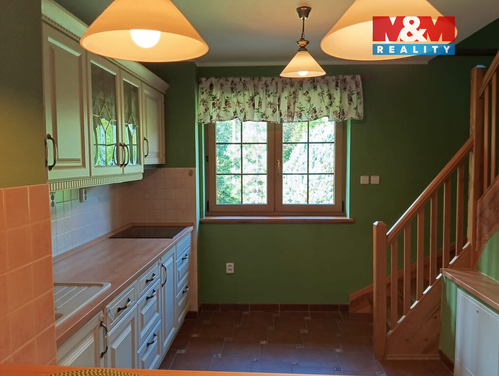 Z kuchyně vede dřevěné schodiště do mezonetu, kde je další pokoj a koupelna s toaletou.