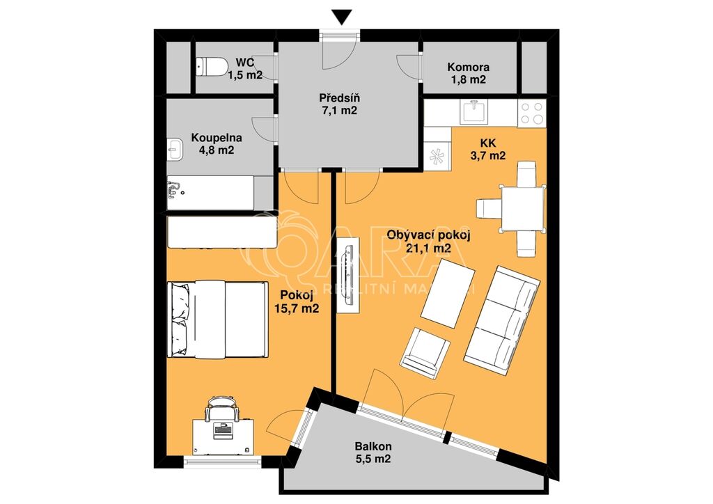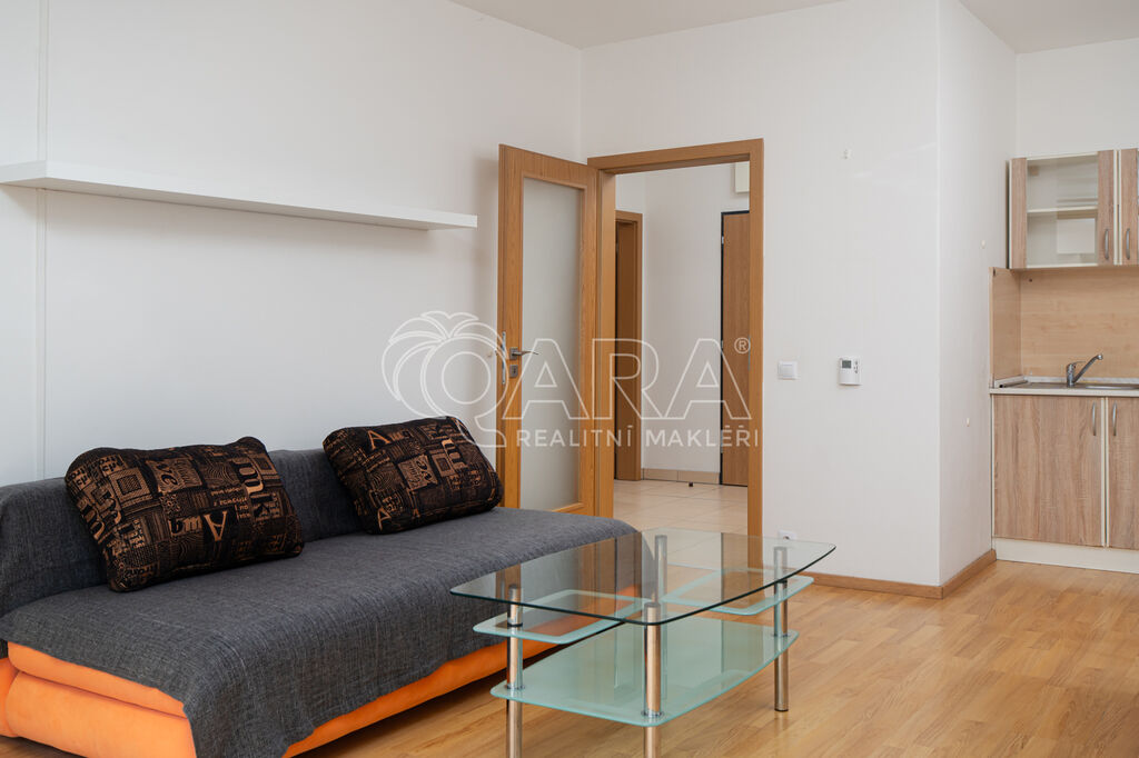 Byt má velmi praktickou a promyšlenou dispozici – z prostorné vstupní haly se vstupuje do ložnice, obývacího pokoje s prostorově oddělenou kuchyní, koupelny s vanou, samostatné toalety a komory, která poslouží jako praktický úložný prostor.