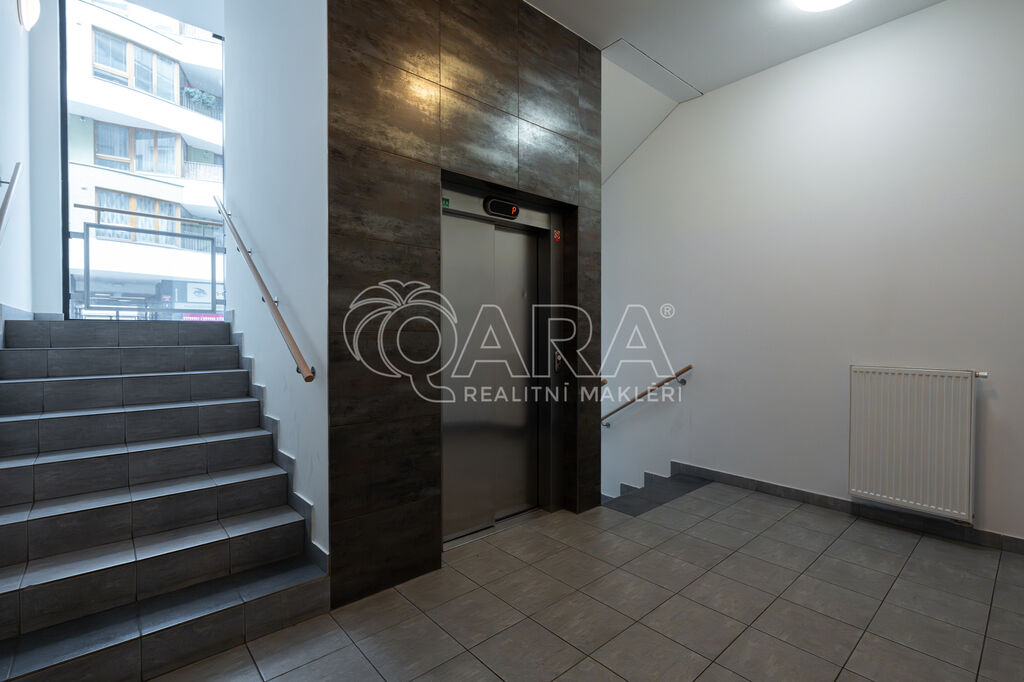 Byt se nachází v moderním domě s výtahem v klidné ulici s veškerou občanskou vybaveností v dosahu.