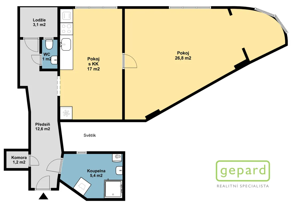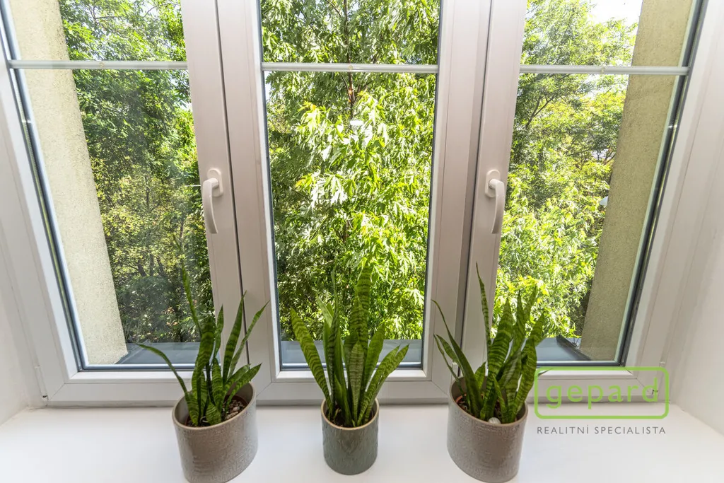 Plocha nabízené bytové jednotky je 64,00 m2, k bytu navíc přísluší lodžie (3,10 m2) a sklepní kóje (4,00 m2). Byt je nabízen včetně vybavení znázorněného na fotografiích: kuchyňská linka s el. troubou, indukční deskou, myčkou, lednicí s mrazákem, dřevěný rozkládací stůl + židle, předsíňová stěna atd. Lodžie a okna pokojů jsou orientována na sever a východ a nabízejí příjemný výhled do zeleně. V bytě je světlý rohový pokoj (26,80 m2) s výklenkem a velkými okny, pokoj s kuchyňským koutem (17,00 m2 - tento pokoj je průchozí), chodba (12,60 m2), koupelna (5,40 m2) se sprchovým koutem, WC (1,00 m2), komora (1,20 m2) a lodžie (přístupná z chodby bytu). Vytápění a ohřev vody (mimo kuchyň) je zajištěn plynovým kotlem, v kuchyni je průtokový ohřívač. Ve vnitrobloku je příjemná společná zahrada s možností posezení.