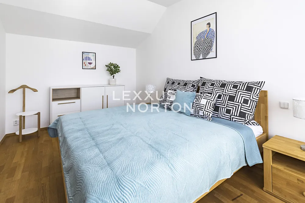 Tento byt k pronájmu nabízí k užívání vstupní chodbu, prostorný obývací pokoj s plně vybaveným kuchyňským koutem (sklokeramická deska, trouba, lednice, mrazák, mikrovlnná trouba a myčka nádobí), ložnici, koupelnu (sprchový kout), samostatnou toaletu a šatnu. Po schodech nahoru se dostanete do patra, které nabízí další ložnici, koupelnu (vana, toaleta a bidet) a komoru. K bytu náleží terasa (28 m2). Byt je navíc vybaven pračkou, klimatizací, předokenními roletami a vestavěnými skříněmi.