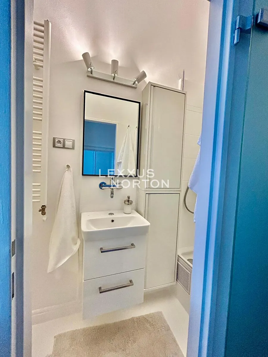 Byt je kompletně zařízen a připraven k okamžitému nastěhování. Součástí vybavení je pračka a sušička, jídelní set umístěný v kuchyňské části, sedací souprava s konferenčním stolkem, televizí a postel v obývacím pokoji. Úložné prostory zajišťuje vestavěná skříň.