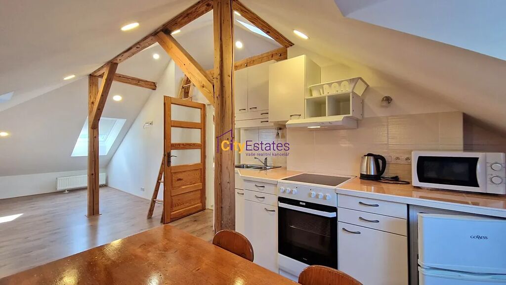 Nabízíme k pronájmu krásný byt 2+kk v druhém patře vily na Farkáni v ul. Na Vysoké I. Byt je plně vybavený a sestává z předsíně, obývacího pokoje s kuchyní, ložnice, prostorné koupelny a malého spacího podstropního patra. K dispozici je krásná zahrada kterou je možné využívat. Orientace bytu je na