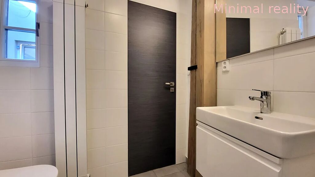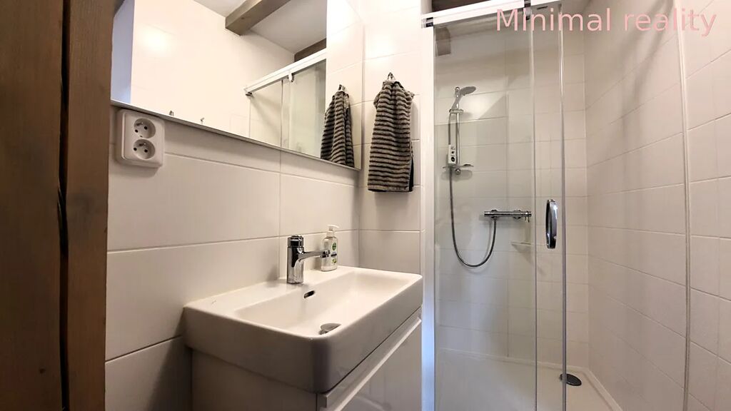 Koupelna je vybavena umyvadlem se skříňkou, zrcadlem, sprchovým koutem s posuvnými dveřmi, toaletou a radiátorem.