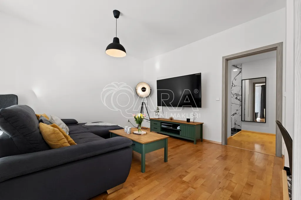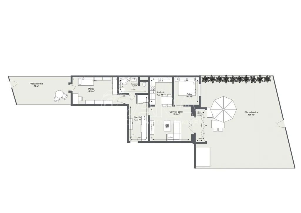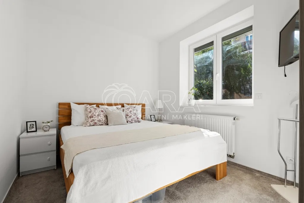 Dominantou bytu je obývací pokoj s kuchyňským koutem, ze kterého se přes zimní zahradu dostanete na západně orientovanou předzahrádku o velikosti 106 m². Ta nabízí příjemné posezení, dostatek soukromí a možnost trávit čas venku prakticky od jara do podzimu.