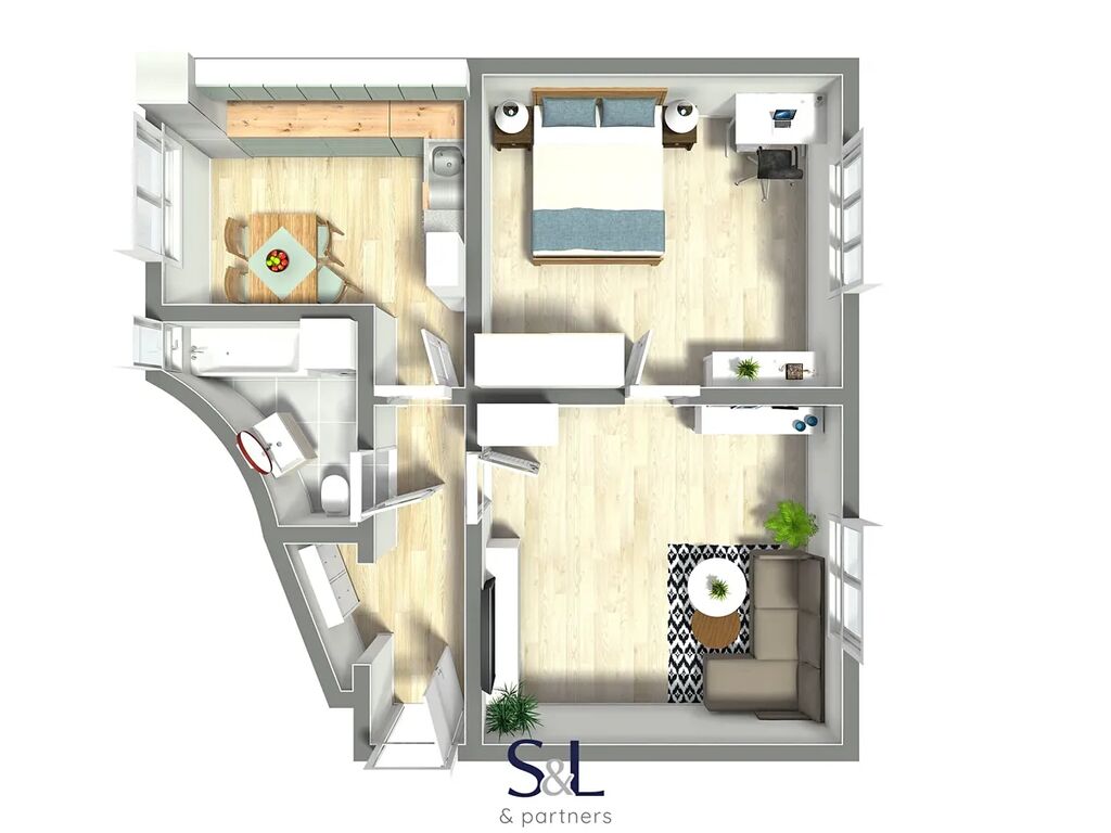 K dispozici jsou dva prostorné pokoje, dále kuchyň vybavená novou kuchyňskou linkou a místem pro jídelní stůl, koupelna se sedací vanou a prostorem pro pračku i sušičku, a chodba s praktickým výklenkem.