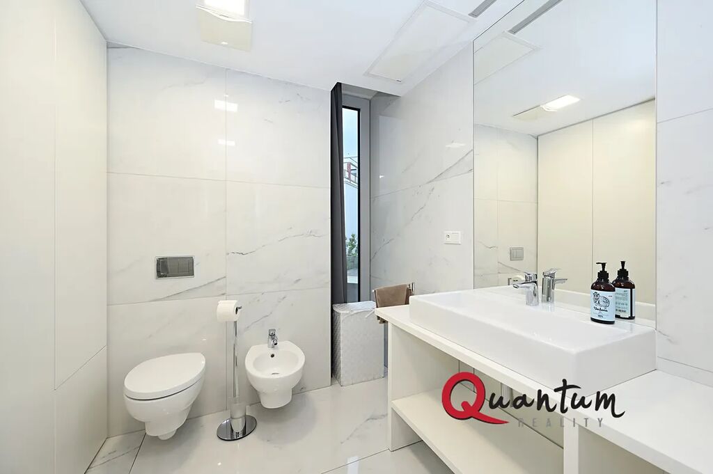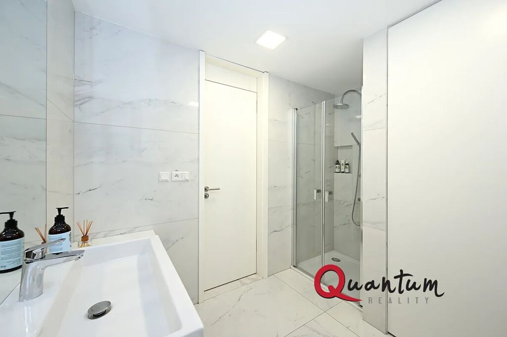 Součástí kanceláře je i prostorná koupelna se sprchovým koutem, toaletou a umyvadlem. Po celém kancelářském prostoru jsou nainstalované úložné prostory, které zajišťují praktické a elegantní řešení úschovy dokumentů či vybavení.