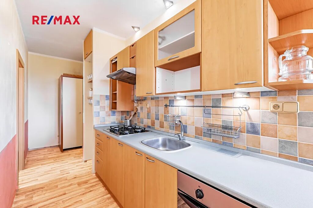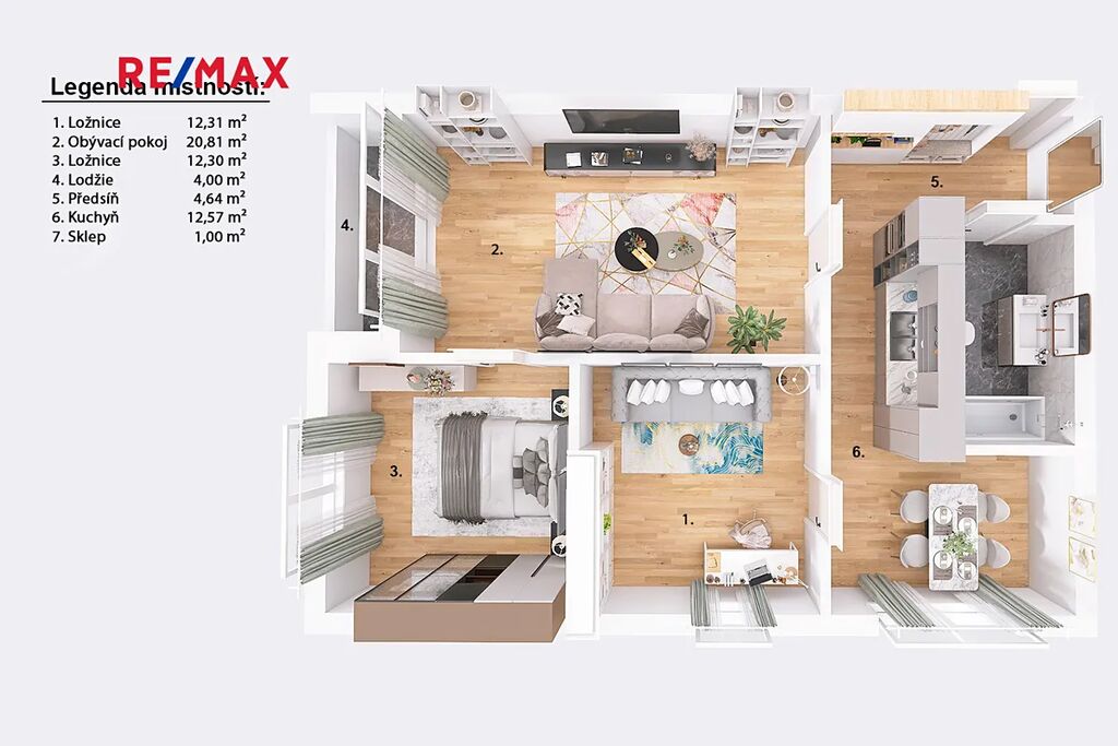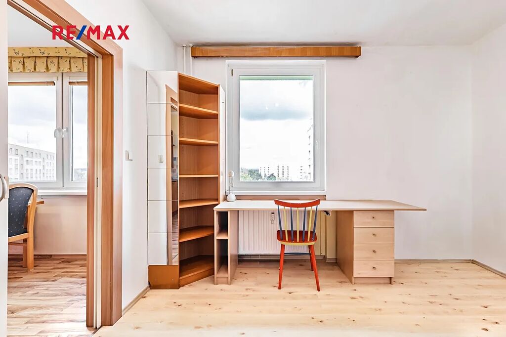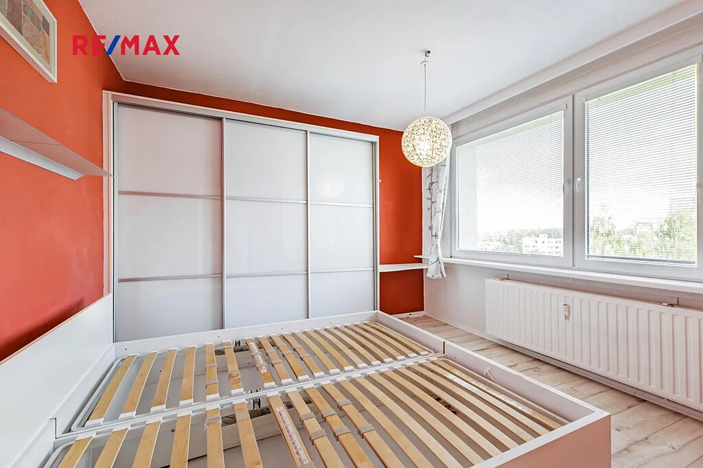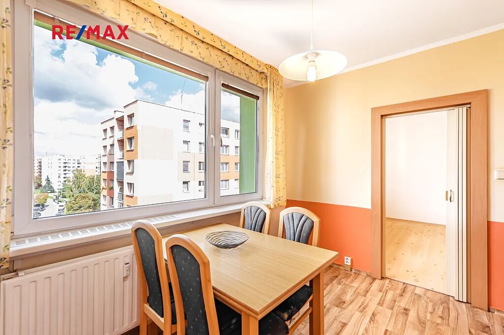 Byt se nachází v šestém patře (sedmém nadzemním podlaží) panelového domu s výtahem. Při vstupu do bytu se nacházíme ve větší předsíni (zádveří). Naproti nám je koupelna s toaletou. Z předsíně se můžeme vydat dále do kuchyně s jídelnou nebo do obývacího pokoje s prostornou lodžií. Díky velkým oknům je tato místnost přirozeně světlá, díky čemuž Vám dodá na pocitu svěžího bydlení. U obývacího pokoje se pak nachází hlavní ložnice. Druhý pokoj, který můžete využít jako další ložnici, pracovnu nebo místnost pro hosty, se pak nachází u jídelny. Kuchyně a pokoj u jídelny jsou orientovány na sever, zatímco obývací pokoj a hlavní ložnice na východ. Součástí pronájmu je ještě sklepní kóje v přízemí domu.