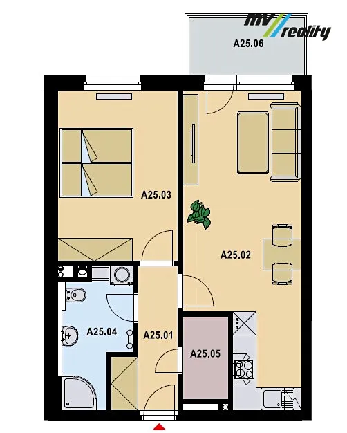 Dispozice bytu: vstupní chodba, komora, koupelna se sprchou a toaletou, ložnice a obývací pokoj s kuchyňským koutem.
