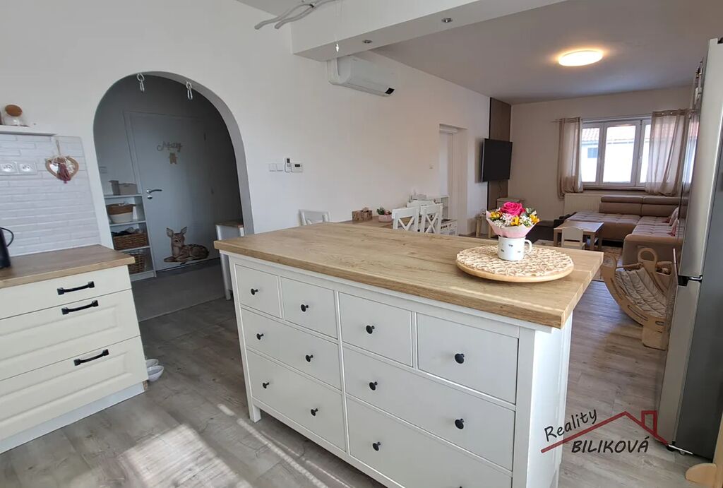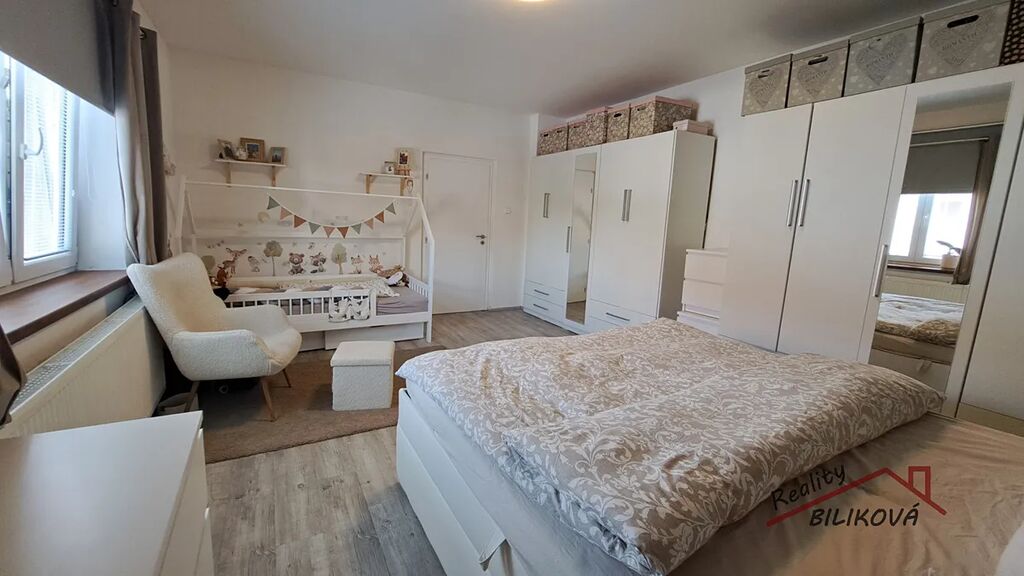 2.NP předsíň, obývací pokoj s kuchyní 35,8m2, ložnice23,7m2, pokoj 5,8m2, koupelna, WC a komora.