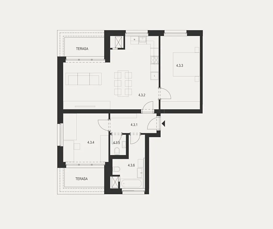 Předmětem nabídky je byt 3+kk s dvěma terasami (8,7 m2), který nabízí výměru o podlahové ploše 86,44 m2. Dispozičně se člení na účelnou vstupní chodbu, koupelnu s vanou, umyvadlem a WC, samostatnou toaletu s umyvadlem, ložnici, dětský pokoj se vstupem na terasu a hlavní obytnou místnost s kuchyňským koutem se vstupem na druhou terasu. Přestože je byt orientovaný na severovýchod, tak díky velkým balkonovým dveřím je v bytě dostatek přirozeného světla. Velkým benefitem je podélné okno v koupelně, které zajistí dostatek světla i odvětrání a praktická přizdívka u umyvadla. Terasy nabízí příjemný odpočinek i v parném létě a výhled z výšky do krajiny.