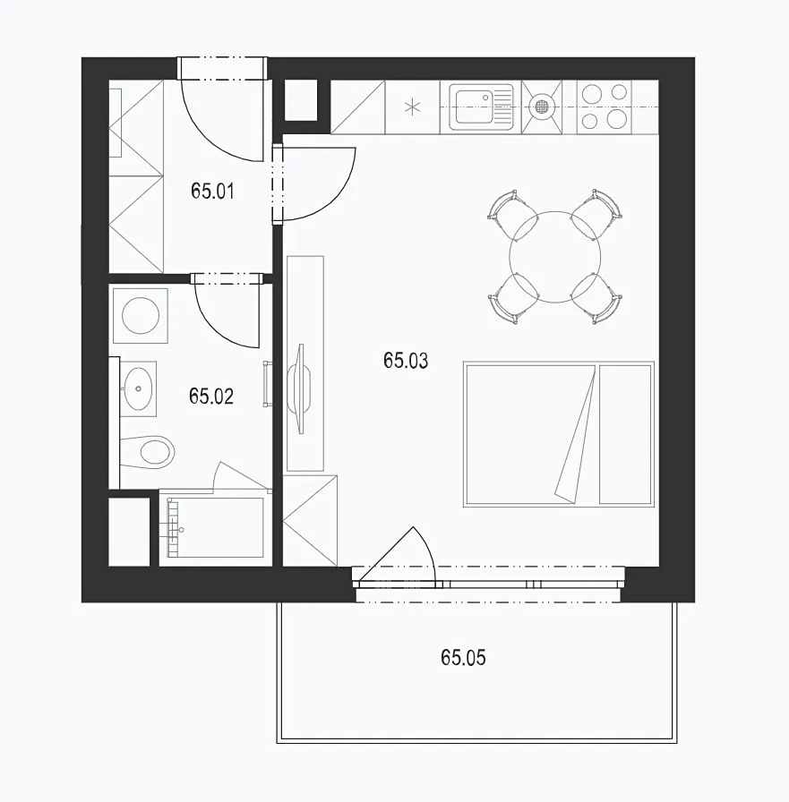 Byt C25 s dispozicí 1+kk o podlahové ploše 34,74 m² je prakticky uspořádaný. Dispozičně se člení na vstupní chodbu, koupelnu se sprchovým koutem, WC, umyvadlem a prostorem pro umístění pračky a hlavní obytnou místnost s kuchyňským koutem a vstupem na balkón (6,45 m²).