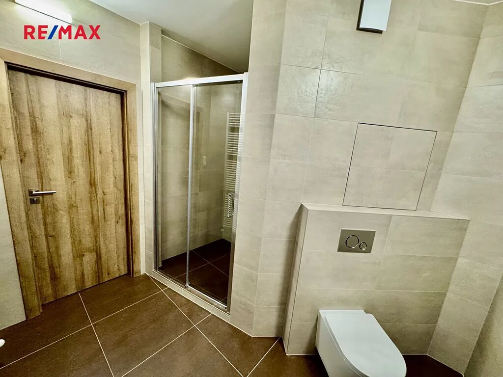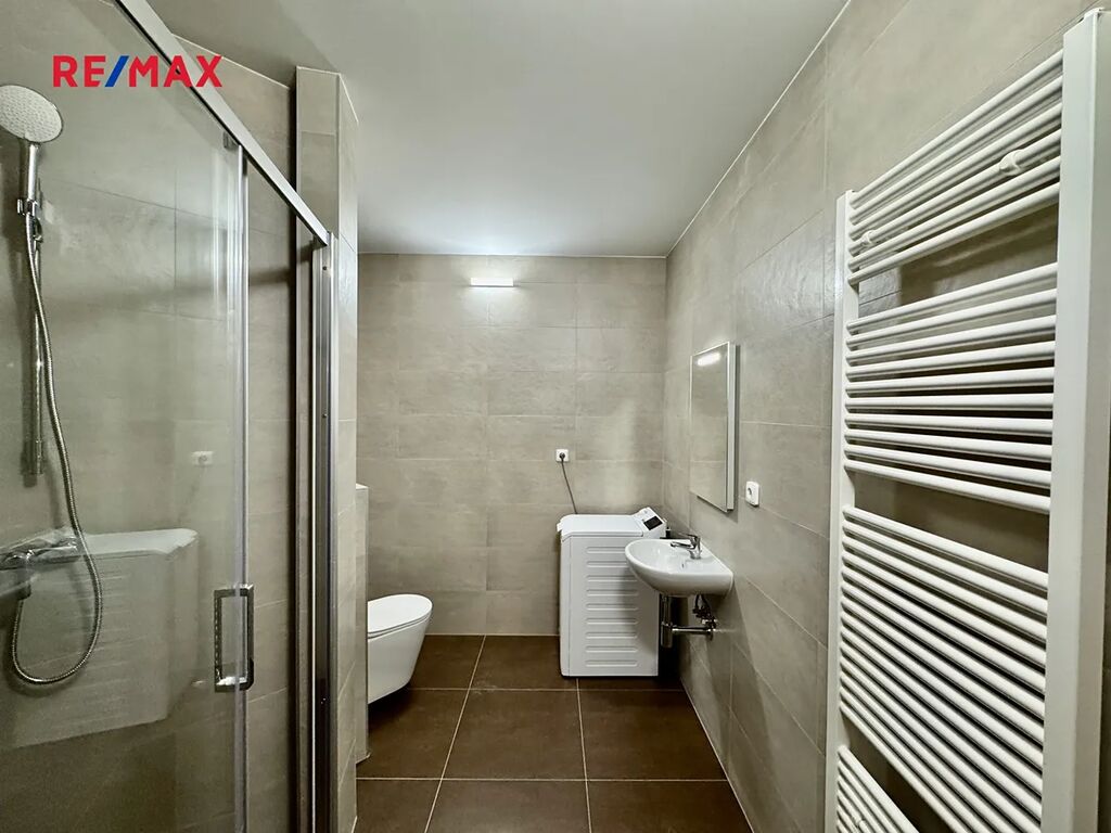 Moderní koupelna nabízí sprchový kout, umyvadlo, WC a prostor pro pračku. Z ložnice je vstup na balkón s výhledem do klidné části Modřan, který dodává bytu příjemnou atmosféru.