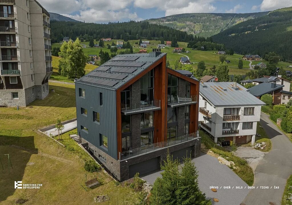 Tento výjimečný mezonetový byt o dispozici 5+kk se nachází v butikové novostavbě pouhých čtyř jednotek, přímo naproti hlavnímu lyžařskému svahu v Peci pod Sněžkou.