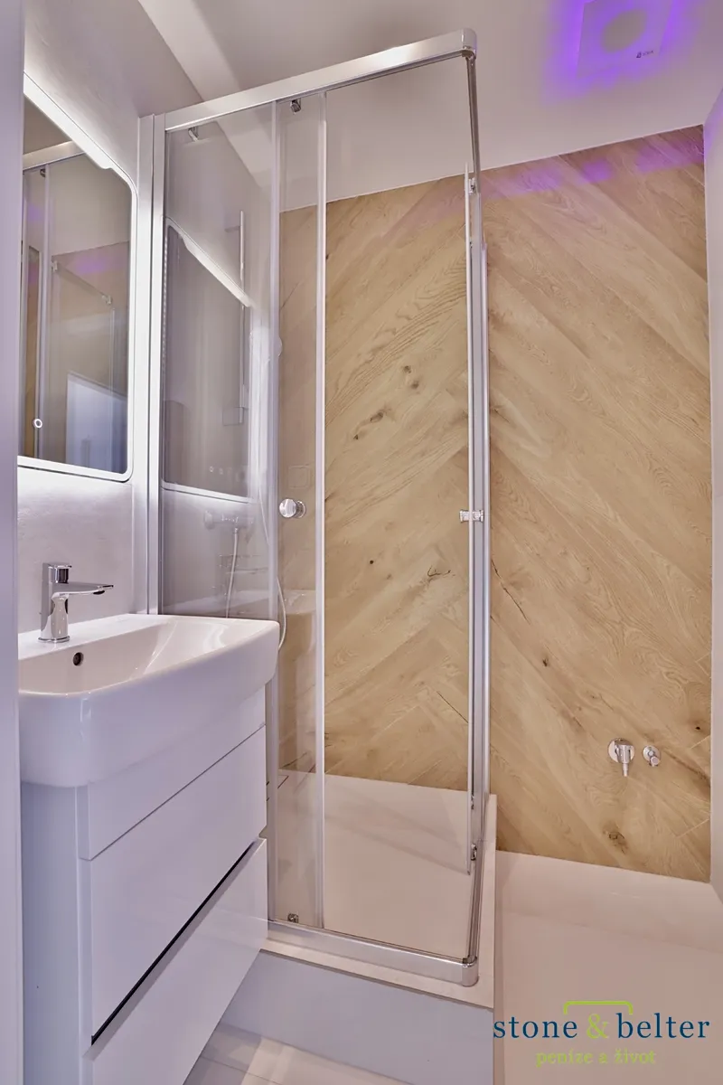 Podlahy tvoří kvalitní vinyl, byt je vybaven moderním nábytkem a připraven k okamžitému nastěhování.