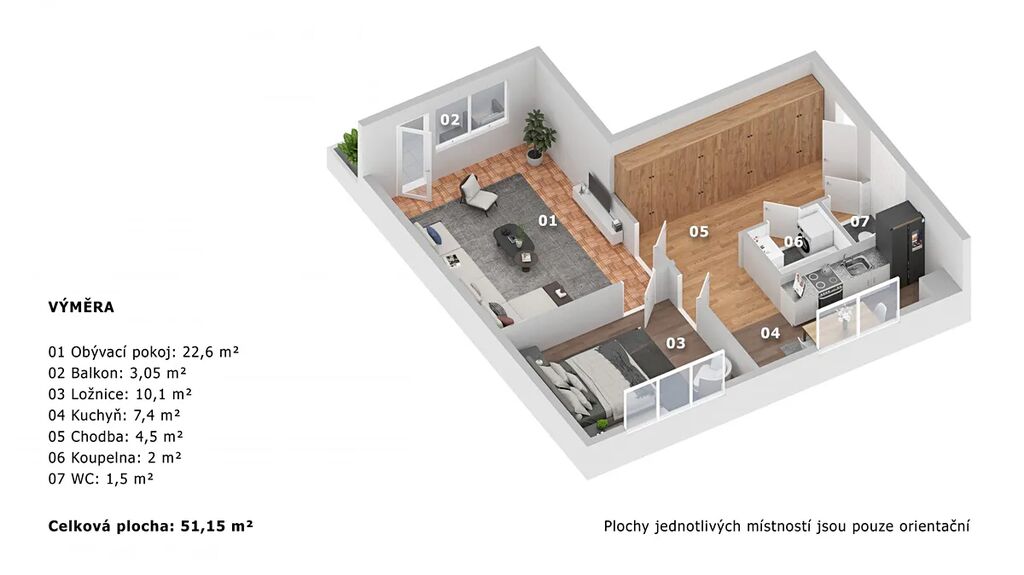 Obývací pokoj (22,6 m) se vstupem na balkon (3,3 m), samostatná ložnice (cca 13,9 m), kuchyně s plynovým sporákem (9 m), koupelna s vanou, WC zvlášť, sklep (1,15m2); evidenční plocha vedená správcem domu činí 55,52 m. Byt je umístěn ve 3. nadzemním podlaží.