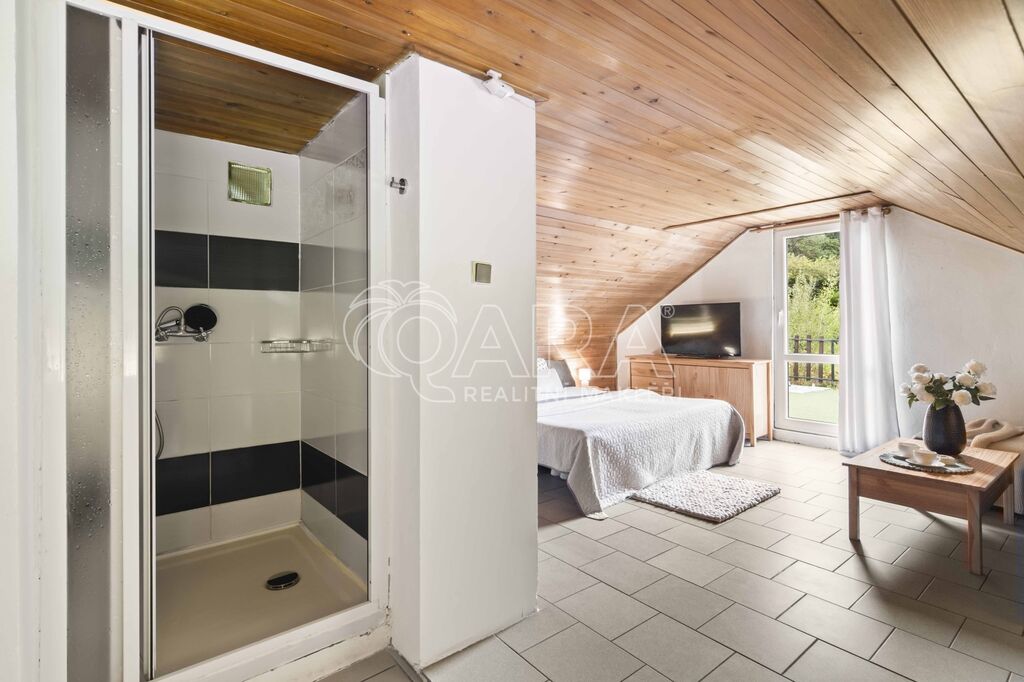 V prvním nadzemním podlaží se nachází předsíň (cca 10,5 m2), chodba (2,6 m2), prostorný obývací pokoj s kuchyňským koutem (34 m2), ložnice (10 m2), pokoj (11,8 m2), samostatná toaleta, koupelna s vanou a technická místnost. Z obývacího pokoje je vstup na terasu se zastřešenou pergolou (cca 14 m2). Obývací pokoj lze jednoduše rozdělit na dva pokoje. Druhé nadzemní podlaží sestává z galerie, pokoje s kuchyňským koutem (30 m2), sprchového koutu a samostatné toalety. Z pokoje je pak vstup na prostornou střešní terasu (25,7 m2).