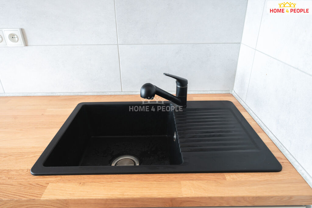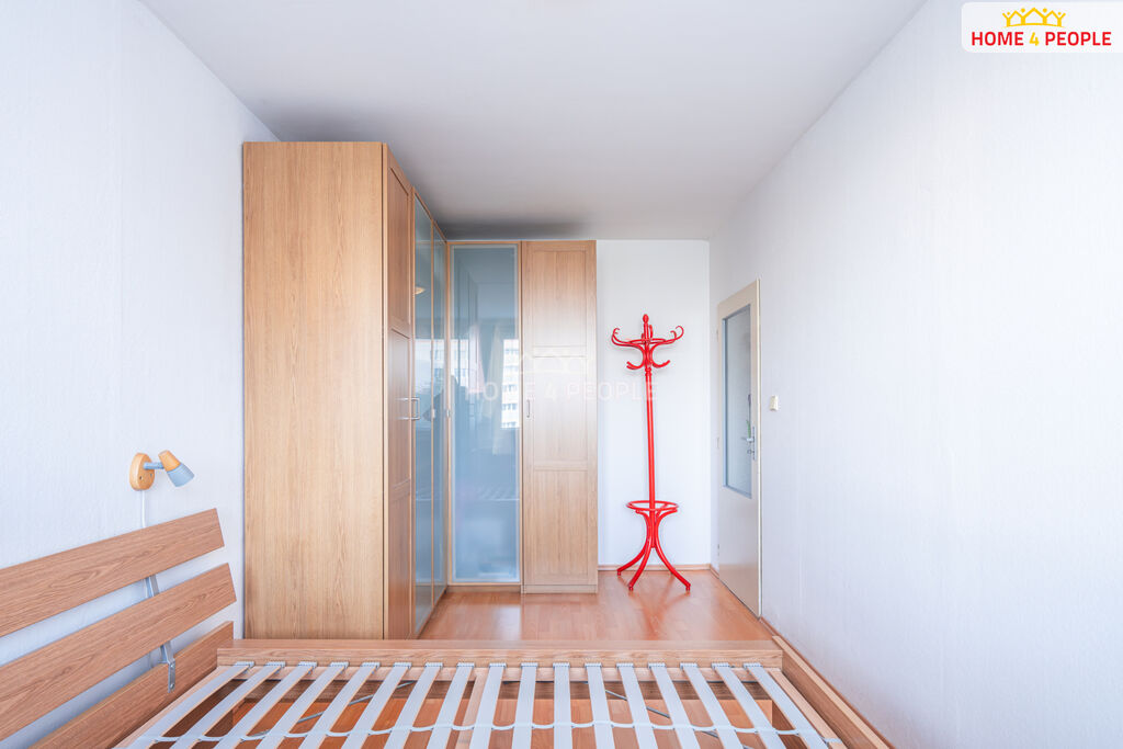 Z jedné strany bytu je příjemný výhled do klidného vnitrobloku, ve kterém se nachází malé náměstí s uměleckou instalací z kamene – několik kamenů rozmístěných vedle sebe vytváří zajímavý a odpočinkový prostor.