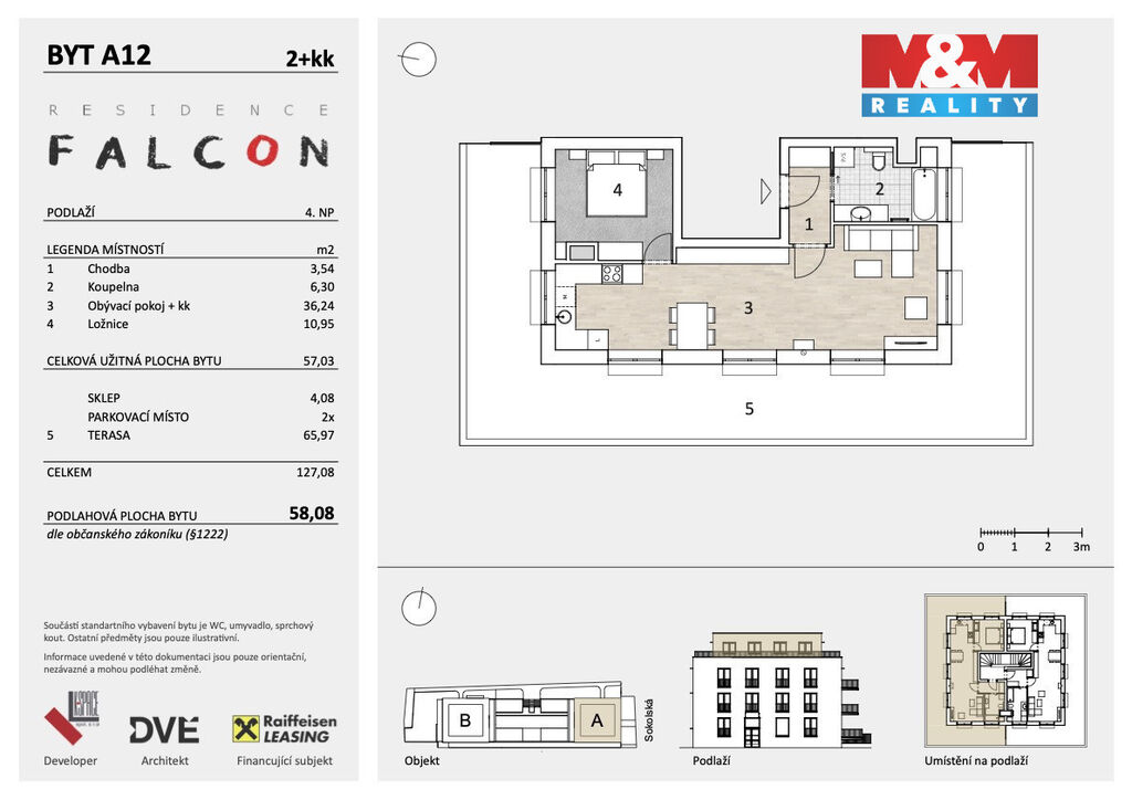 Byt se nachází ve 4. podlaží a nabízí dispozici 2kk o výměře 58,08 m². K jednotce náleží nástřešní terasa o rozloze 65,97m², sklep 4,08m² a dvě parkovací stání. Klienti mají na výběr ze dvou vysokých standardů vybavení – Friendly a Gorgeous, zahrnujících velkoformátová okna, izolační trojskla a kvalitní materiály.