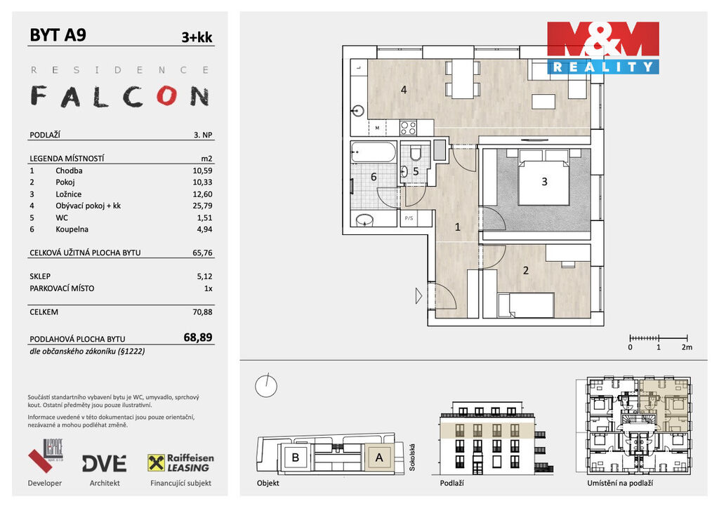 Byt se nachází ve 2. podlaží a nabízí dispozici 3+kk o výměře 68,89 m². K jednotce náleží sklep o velikosti 5,12m² a parkovací stání. Klienti mají na výběr ze dvou vysokých standardů vybavení – Friendly a Gorgeous, zahrnujících velkoformátová okna, izolační trojskla a kvalitní materiály.