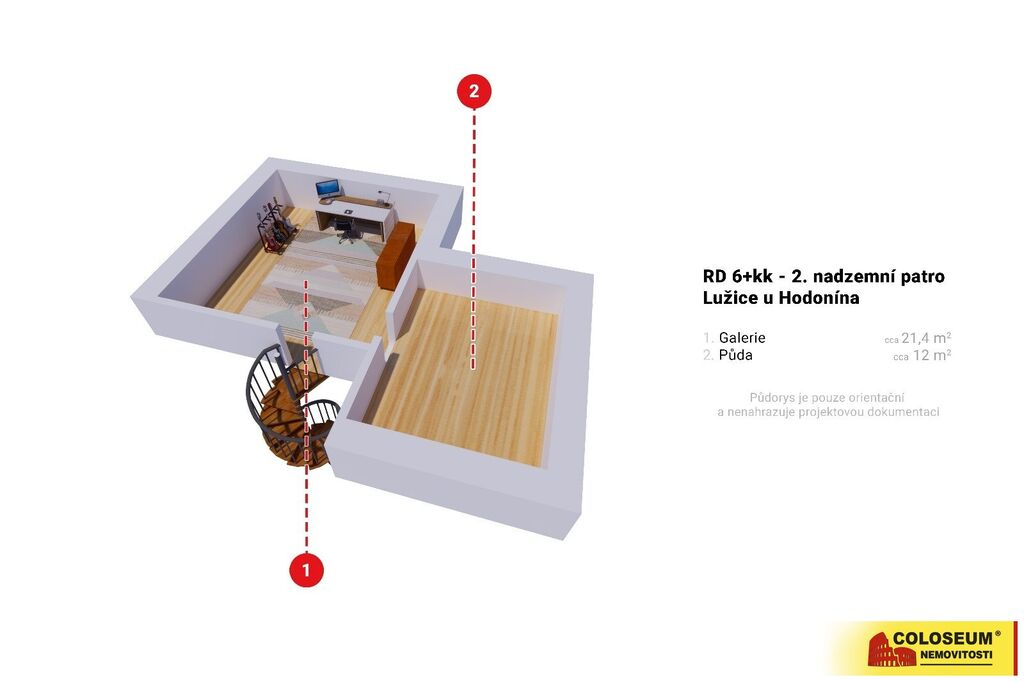 Po točitém schodišti vystoupáme do podkroví, kde je pracovna a úložné prostory s půdou.