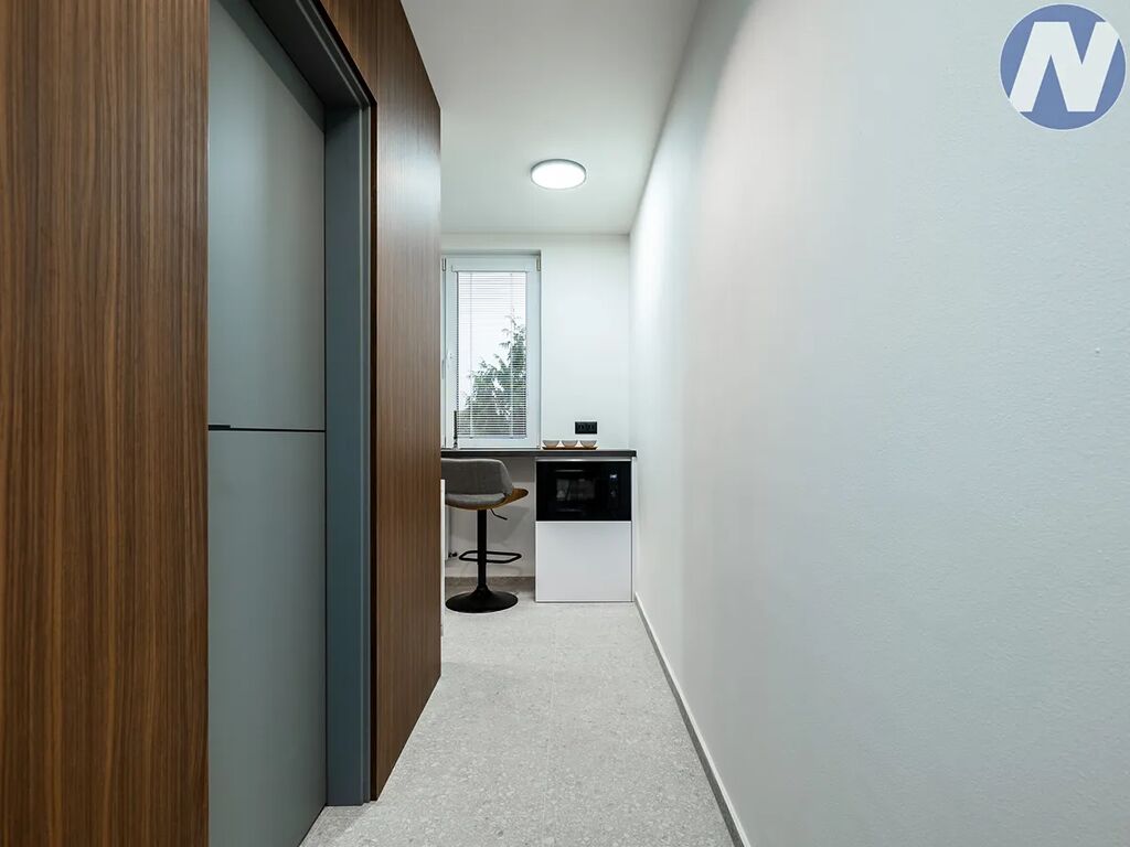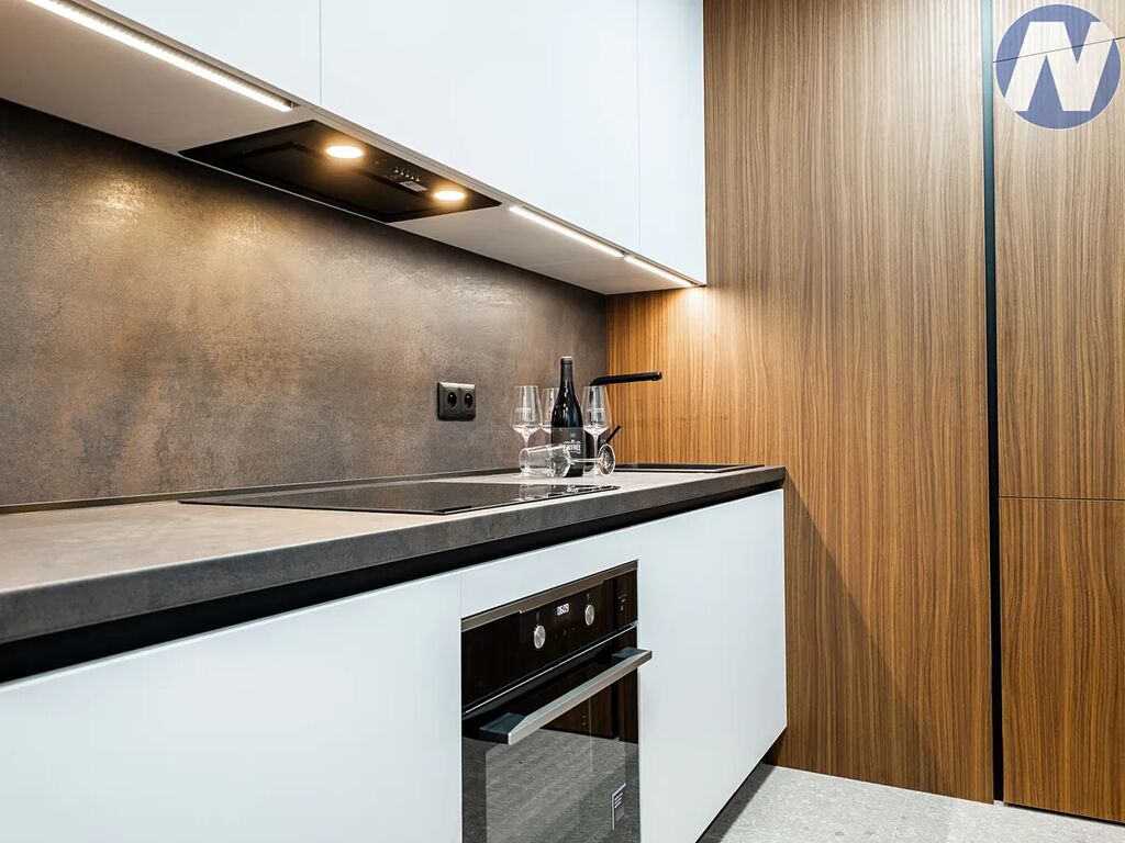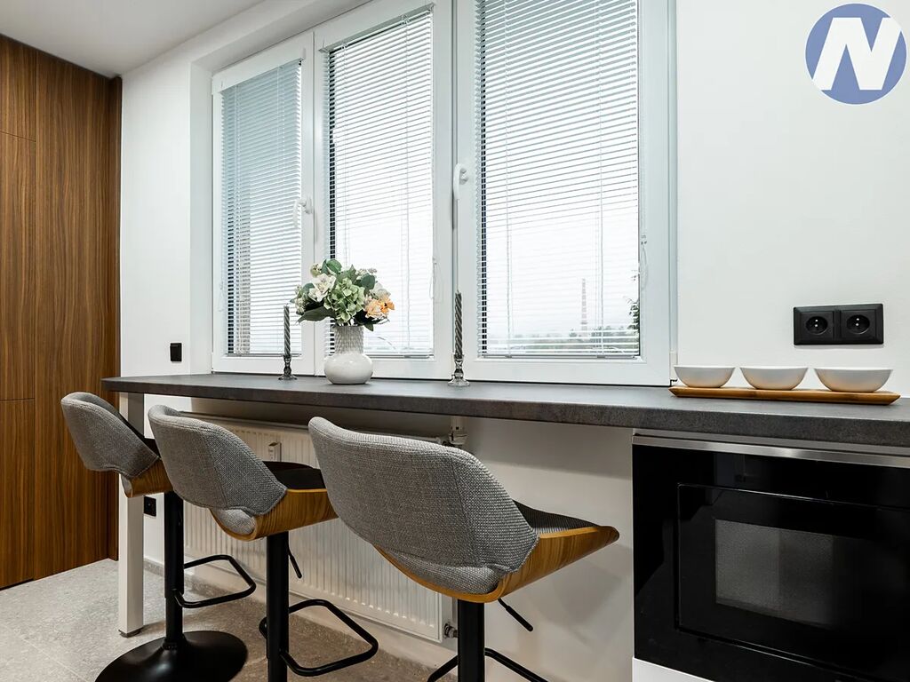Dominantou bytu je moderní kuchyně od společnosti Sykora, vybavená nadstandardními spotřebiči Electrolux – parní troubou, myčkou, varnou deskou, mikrovlnkou, digestoří i pračkou se sušičkou. Kuchyně je nejen estetická, ale také maximálně funkční.