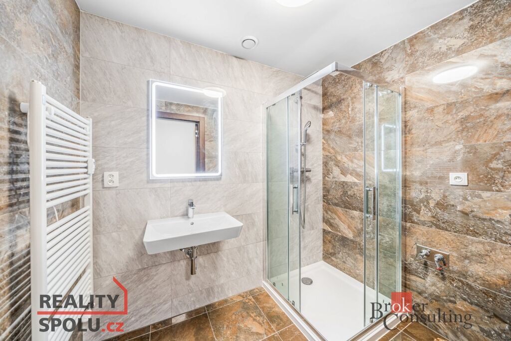 V samotném interiéru se dbalo na detail a výběr materiálů. Naleznete zde tedy velkoformátové obklady a dlažby španělské designové značky Porcelanosa, sanitu Ideal Standard a dřevěné dveře italského výrobce Barausse.
