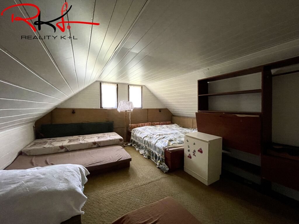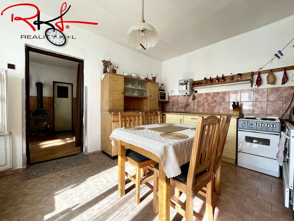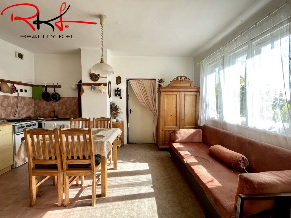 Dispozice: Vstupní chodbou se dostaneme do obývací místnosti, kde najdeme kamna na tuhá paliva, které jsou velmi příjemnou záležitostí třeba v zimním období. Dále je zde vstup do koupelny se sprchovým koutem, na toaletu, komora pro uložení potravin, vstup do kuchyně odkud následuje vstup do ložnice. V patře domu se nachází další dvě místnosti výhledem do ulice a do dvora.