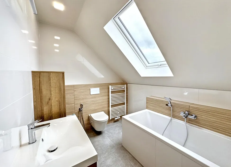 Ve spodním patře se nachází vzdušný a prosvětlený obytný prostor, který plynule propojuje obývací pokoj s jídelnou a plně vybavenou moderní kuchyní, jejíž součástí jsou veškeré spotřebiče včetně myčky, elektrické varné desky či vestavěné trouby. V této části bytu dále naleznete technickou místnost s pračkou a šatnu/komoru, která poskytuje dostatek úložného prostoru. Nechybí ani samostatná toaleta s bidetem. V celém bytě jsou nová střešní okna.