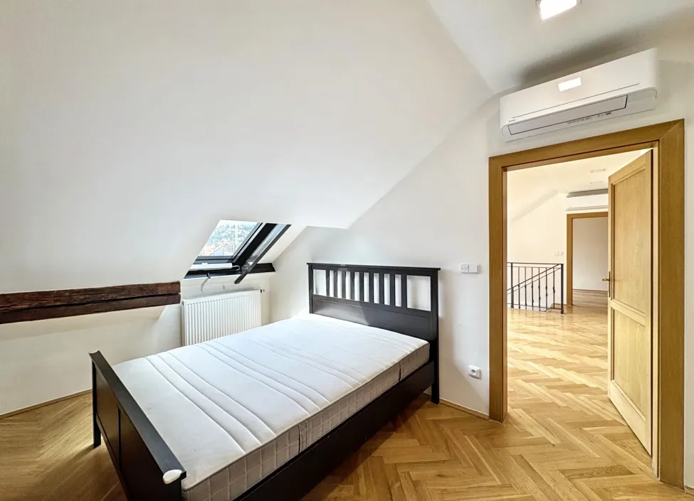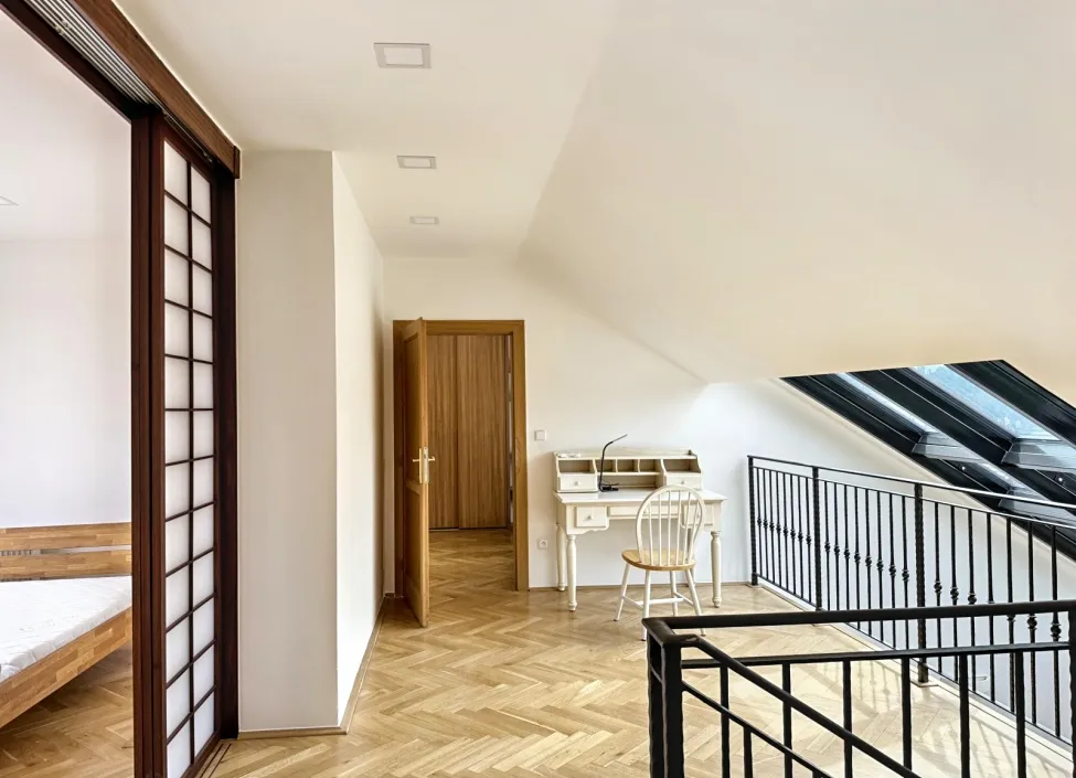 V horním podlaží naleznete tři ložnice: menší ložnici s vestavěnou skříní, hlavní ložnici s vlastní koupelnou a přímým vstupem na prostornou terasu s výhledem na hrad a Petřínskou věž a třetí ložnici také se svou koupelnou se sprchovým koutem a wc. Koupelny jsou plně zrekonstruované.