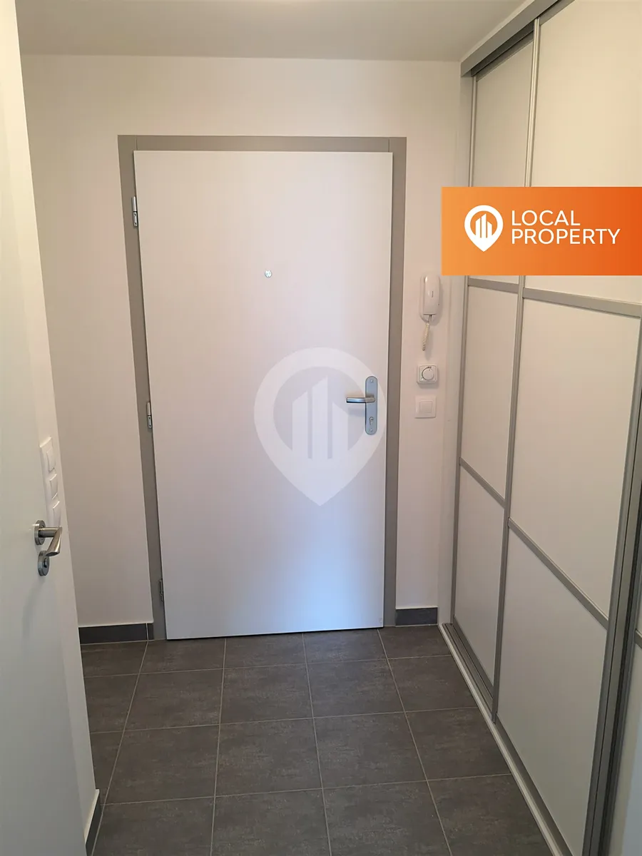 Dispozice bytu - při vstupu je předsíň s vestavěnou skříní. Vpravo se nachází koupelna se sprchovým koutem, pračkou a WC. Z chodby je dále vstup do pokoje s kompletně vybavenou kuchyňskou linkou - sklokeramická varná deska, horkovzdušná trouba, myčka, digestoř, lednice s mrazákem. Byt je vybaven rekuperací, díky které je v domácnosti zajištěn stálý přísun čerstvého vzduchu. Ten je filtrován a ohříván teplem odcházejícího vzduchu. V bytě je zajištěno zdravé větrání bez zbytečných tepelných ztrát. Orientace bytu je na západ.
