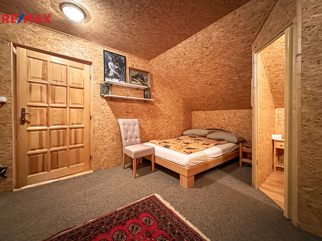 Hlavní budova je vlastně prostorný rod. dům s několika stylově řešenými místnostmi. Dominantou je velký sál (90 m2) s velkým krbem a klenutými stropy a kamennými pilíři, který působí naprosto výjimečně. Součástí je také moderně vybavená kuchyně (s vestavnými spotřebiči - myčka, skloker. deska, horkovzd. trouba), komfortní koupelna (včetně vany a nadstandardně velkého sprch. koutu) i útulné podkroví obložené dřevem, které nabízí prostor pro ložnici, pracovnu nebo relaxační zónu.