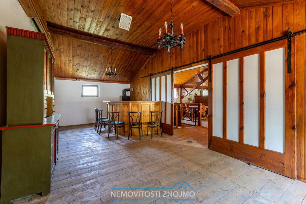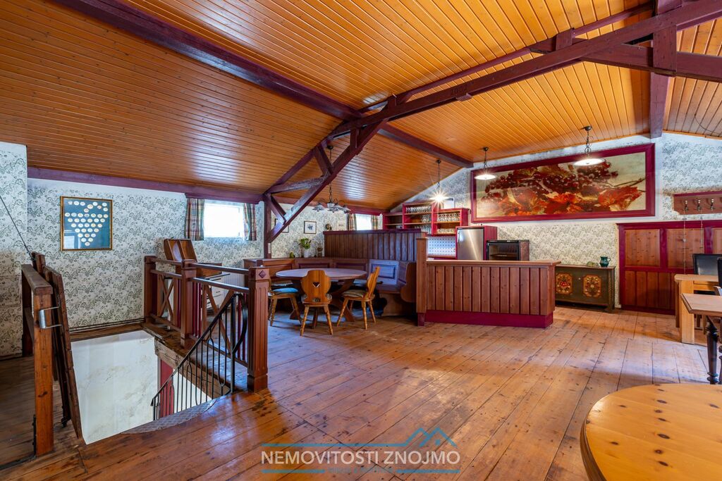 - v patře budovy se nachází bar s posezením (typu restaruace), celkově 2 místnosti se stoly, židlemi a krbem