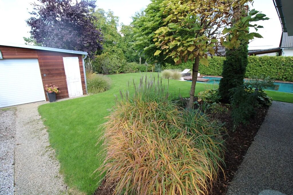 Z obývacího pokoje i z ložnic je přímý vstup na zastřešenou terasu, která nabízí ideální místo pro odpočinek i posezení s rodinou a přáteli. Na terasu navazuje pečlivě udržovaná zahrada s bazénem, poskytující naprosté soukromí.