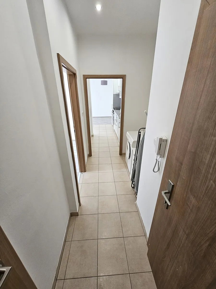 V bytě se nachází obývací pokoj s kuchyňským koutem (kuch. linka, el. trouba s plynovým sporákem, digestoř, lednice, myčka), ložnice, koupelna se sprchovým koutem a s WC, předsíň (pračka) a k bytu náleží i balkón.